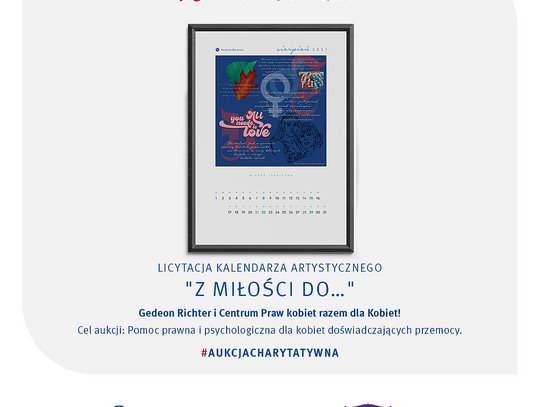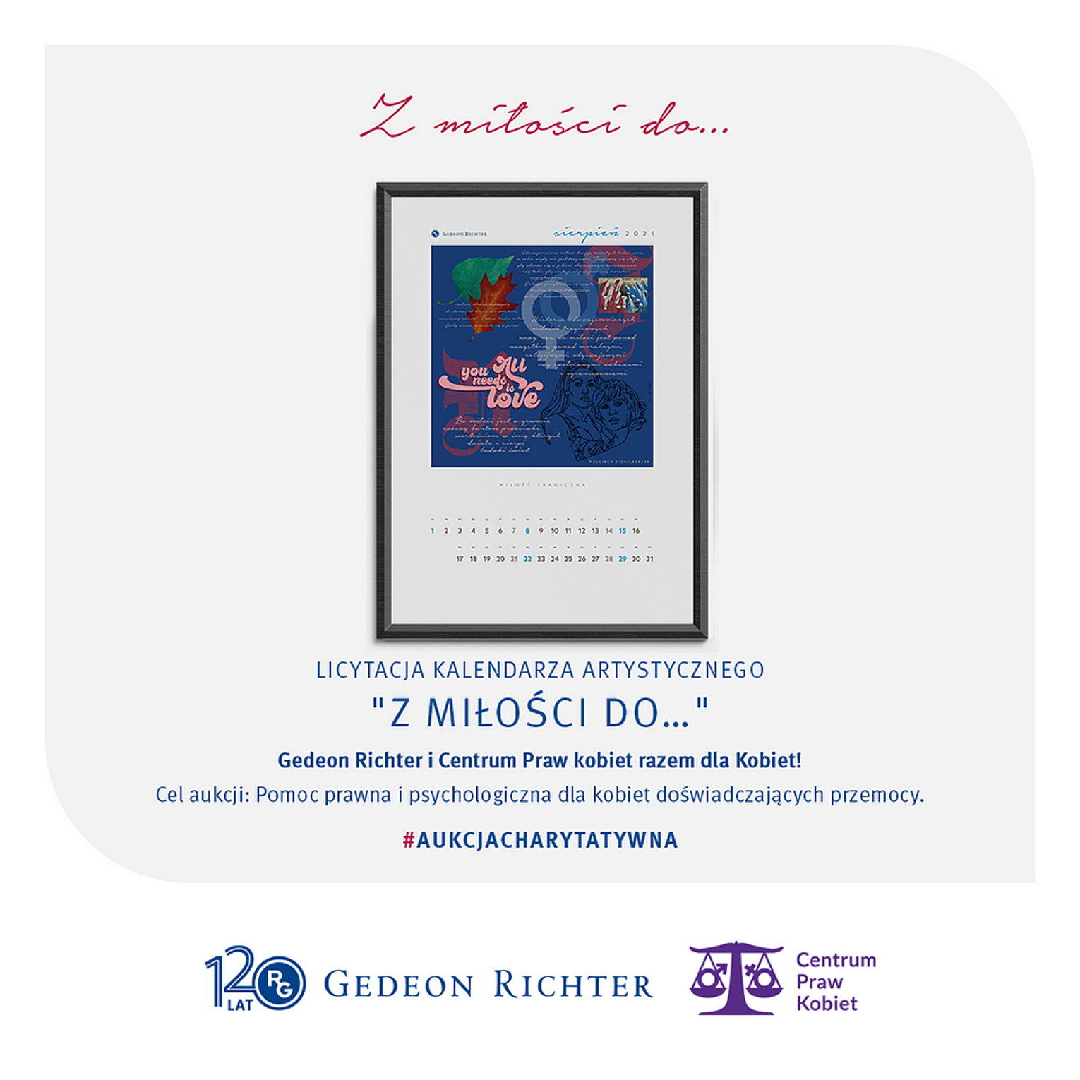 Kalendarze Artystyczne, które powstają każdego roku od blisko dziesięciu lat, nie są przeznaczone do sprzedaży – to kolekcjonerskie perełki, a wśród nich kalendarz na rok 2021 – „Z miłości do…”, poświęcony wyjątkowemu uczuciu, które dotyka każdą i każdego z nas. Na 24 kartach kalendarza przedstawiono 12 odcieni miłości, o których opowiedzieli Katarzyna Miller oraz Wojciech Eichelberger. Autorem ilustracji jest Andrzej Pągowski. To jedyna okazja, by nabyć limitowaną, X edycję Kalendarza Artystycznego Gedeon Richter, a przy tym wesprzeć szczytny cel, jakim jest pomoc prawna i psychologiczna dla kobiet doświadczających przemocy.