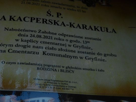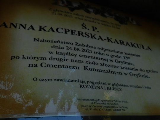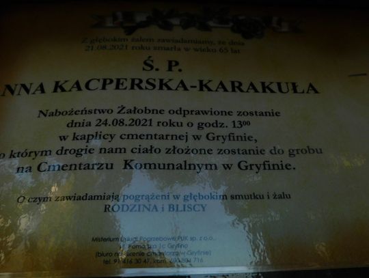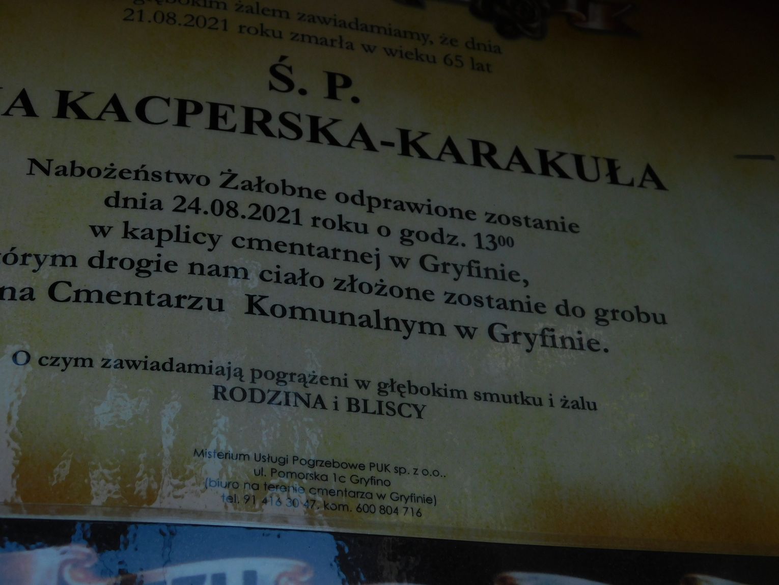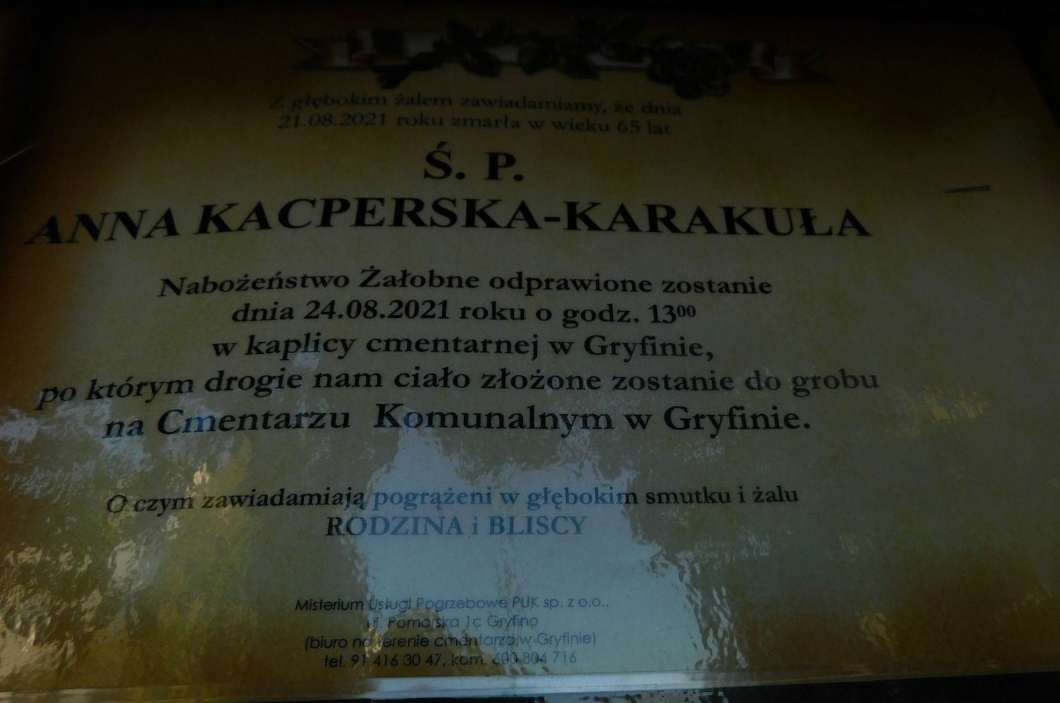 Anna Kacperska-Karakuła - lat 65 (pogrzeb odbył się dziś w Gryfinie)