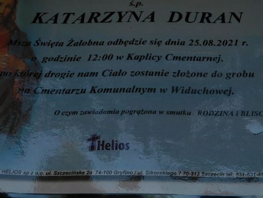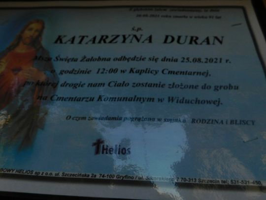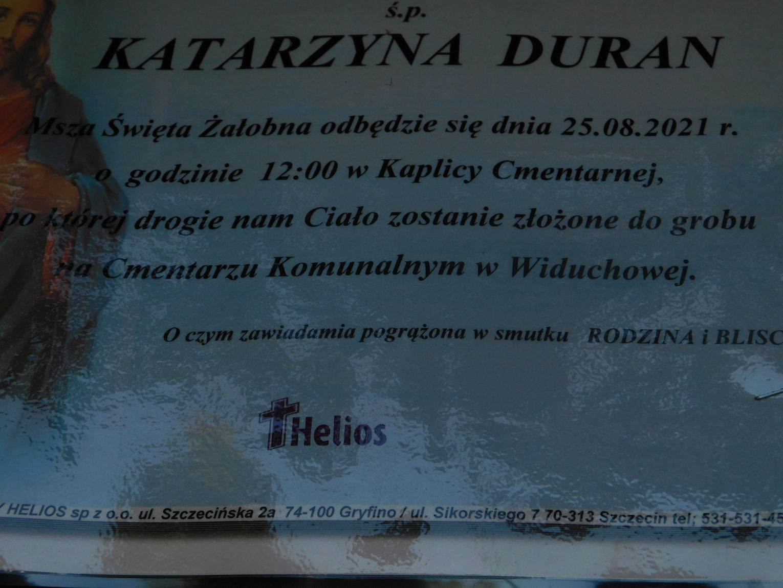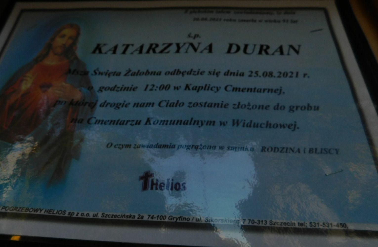 Katarzyna Duran - lat 91 (pogrzeb 25 sierpnia, msza w kaplicy o godz. 12).
