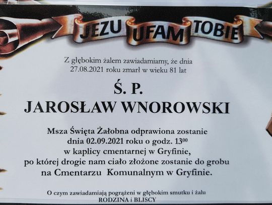 Jarosław Wnorowski - lat 81 (pogrzeb w Gryfinie 2 września, msza w kaplicy o godz.13)