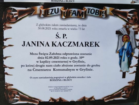 Janina Kaczmarek - lat 73 ((pogrzeb w Gryfinie 2 września, msza w kaplicy o godz.10)