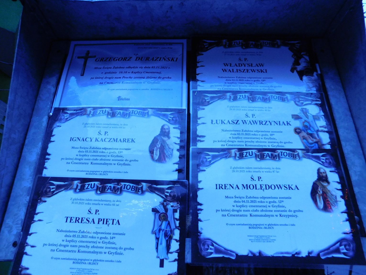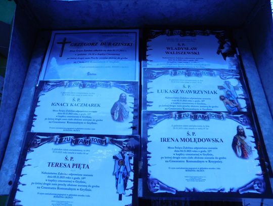 Na tablicach informacyjnych umieszczone są dziś (2 listopada 2021 r.) klepsydry z następującymi nazwiskami: