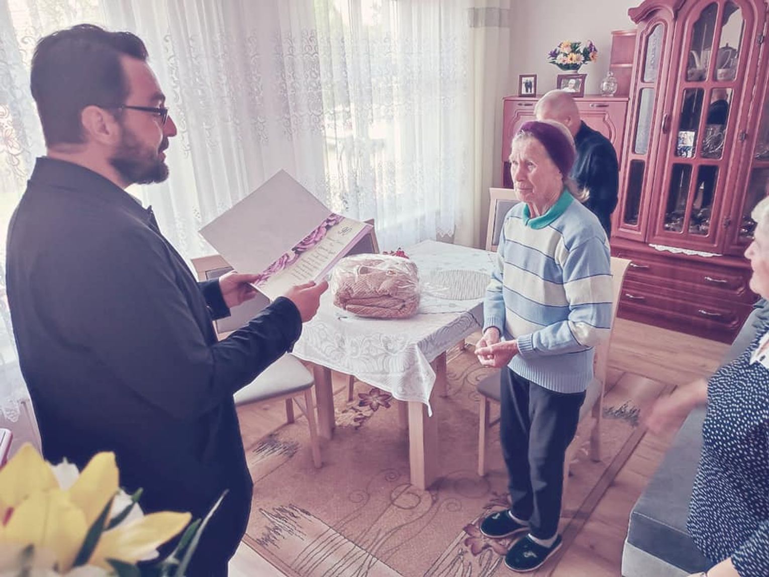 Pani Genowefa otrzymała z rąk wójta upominki okolicznościowe, bukiet kwiatów i życzenia zdrowia.