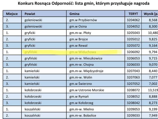 Drugie miejsce i 500 tys. zł zdobyła w konkursie "Rosnąca Odporność" gmina Mieszkowice. Natomiast na trzeciej pozycji znalazła się gm. Chojna, która otrzyma 250 tys. zł.