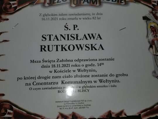 Msza św. żałobna odprawiona zostanie 18 listopada 2021 r. o godz. 14.00 w kościele w Wełtyniu.