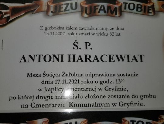 Antoni Haracewiat - zmarł 13 listopada 2021 r. w wieku 82 lat.
