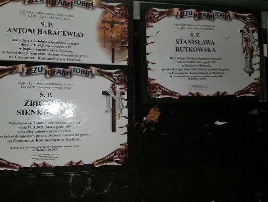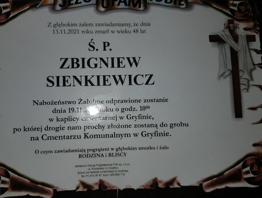 Msza św. żałobna odprawiona zostanie 17 listopada 2021 r. o godz. 13.00 w kaplicy cmentarnej w Gryfinie.