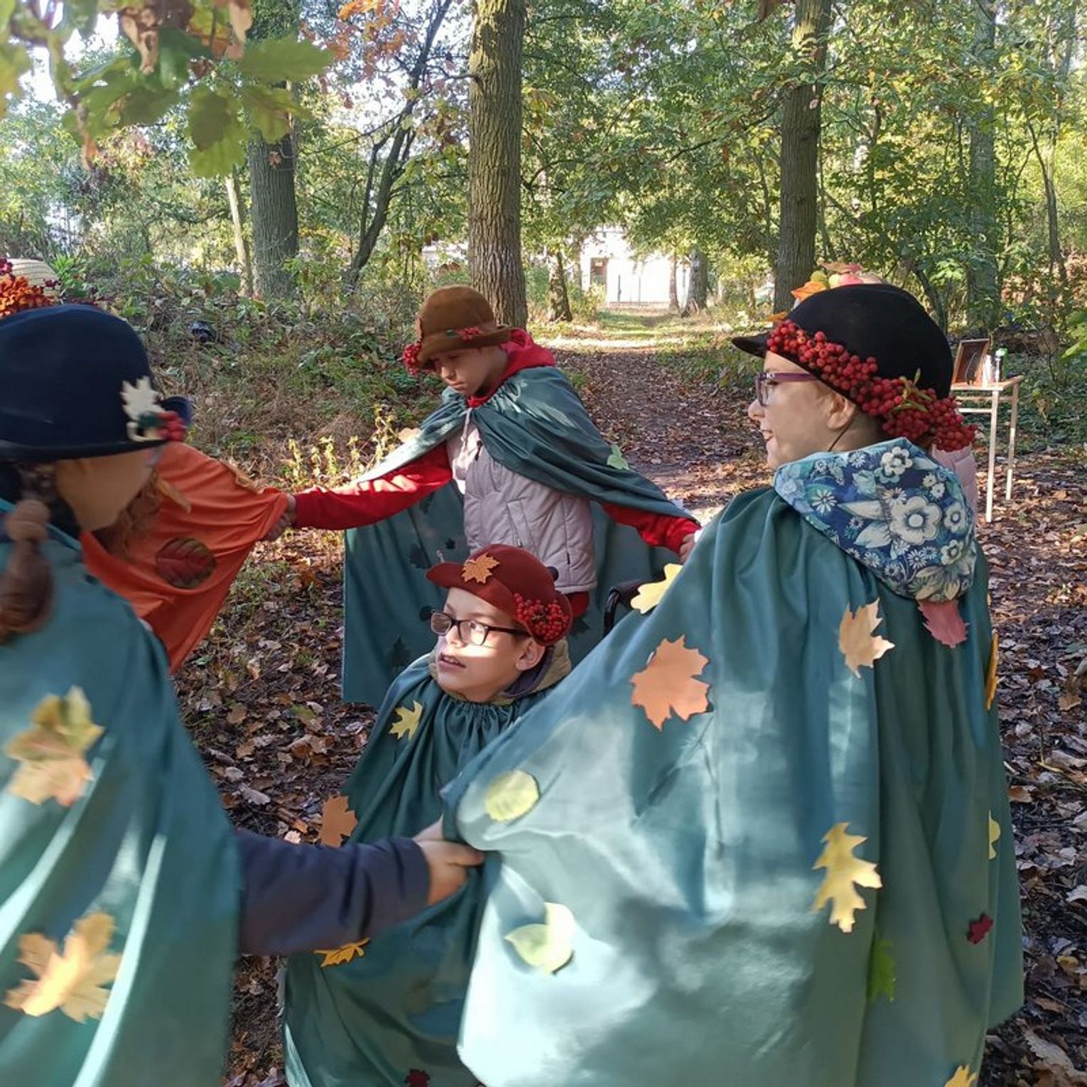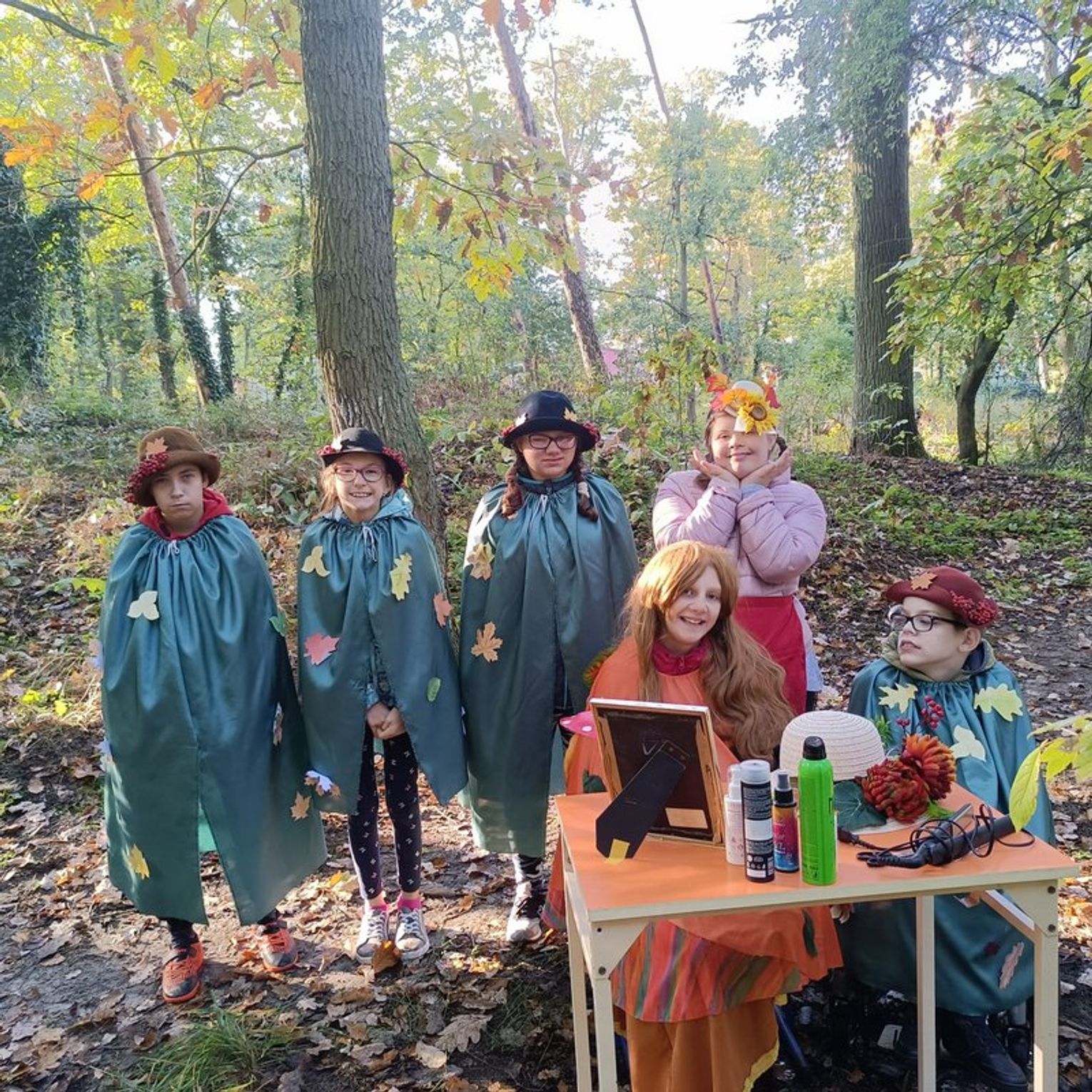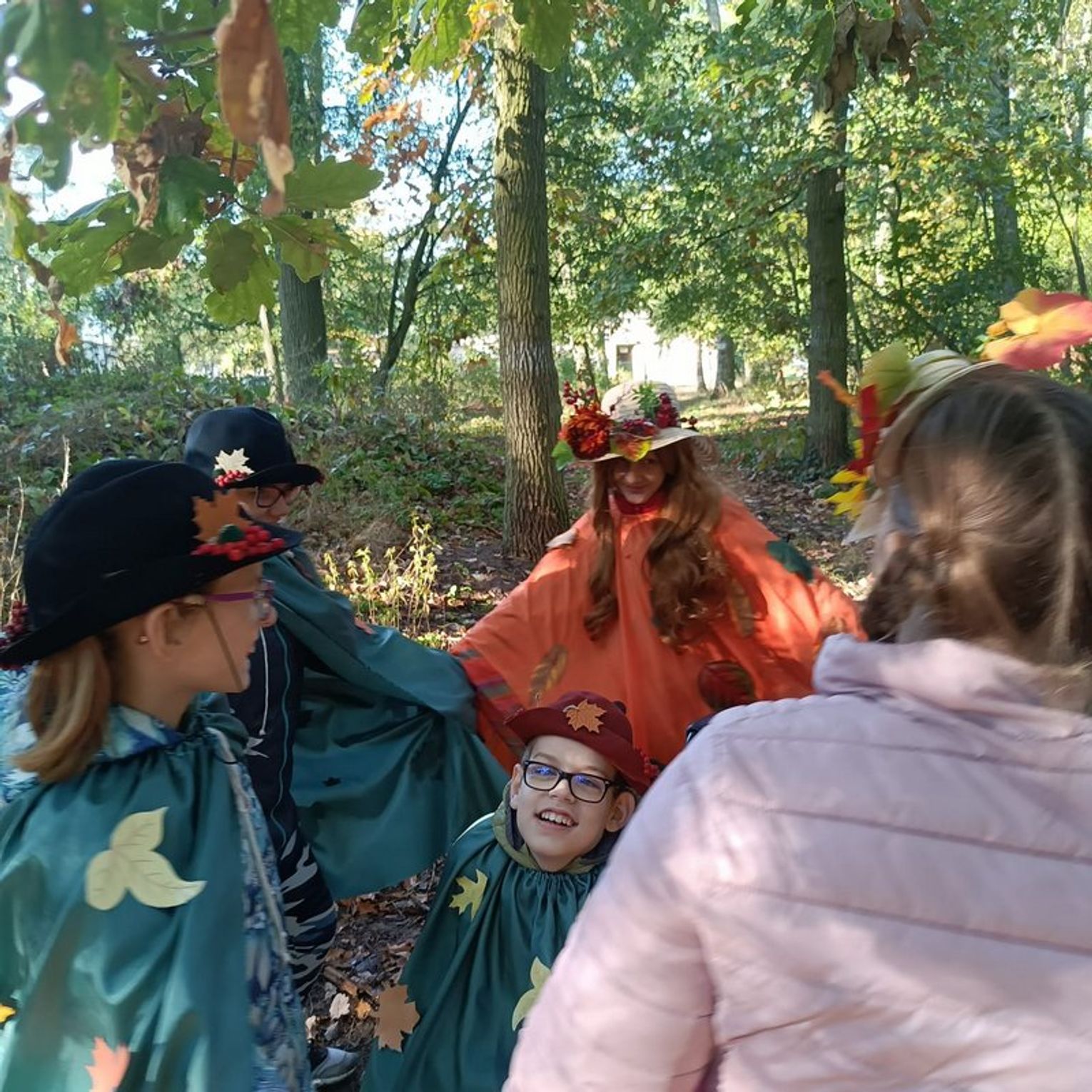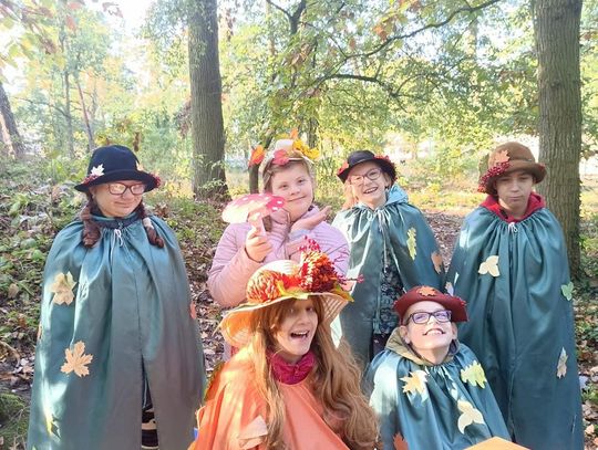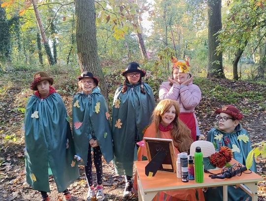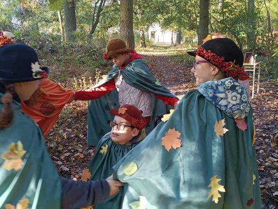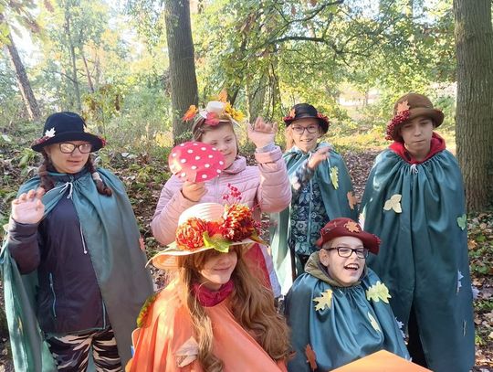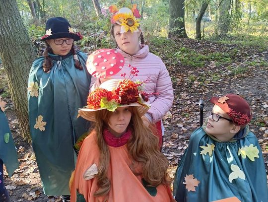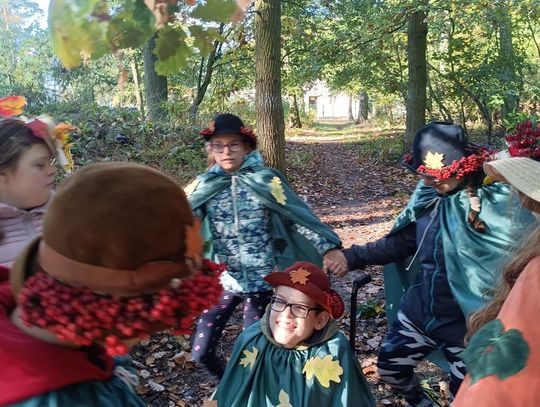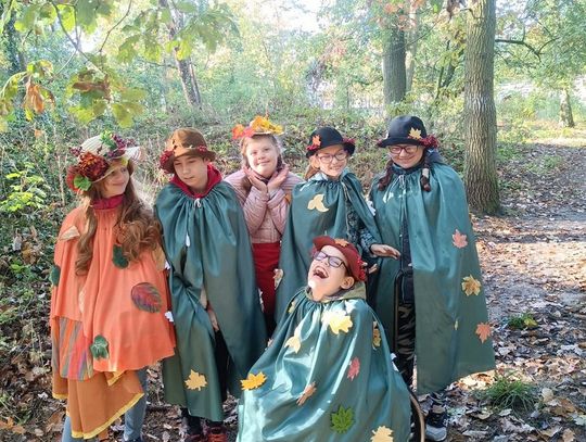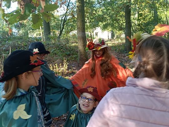 Uczniowie przedstawili krótką scenkę do wiersza Danuty Gellner „Jesień u fryzjera”. Nasi młodzi artyści wcielili się w postaci Pani Jesieni, fryzjera i leśnych ludków. W pięknych okolicznościach przyrody spacerowali po lesie odgrywając swoje role. Wszyscy świetnie się bawili.