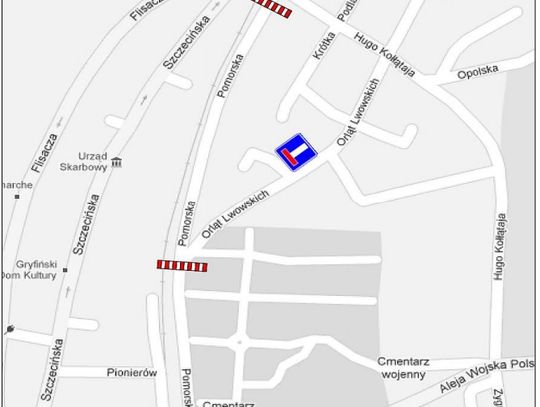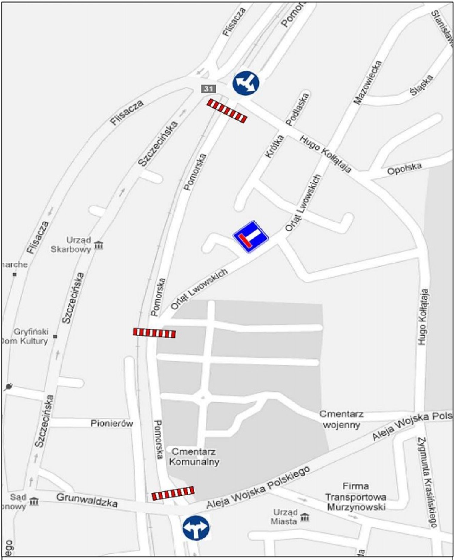 Decyzja o zamknięciu tego odcinka drogi związana jest ze sprzedażą kwiatów i zniczy na parkingu przy cmentarzu komunalnym w Gryfinie.