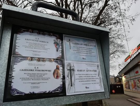 Na tablicach informacyjnych zamieszczono klepsydry z następującymi nazwiskami: