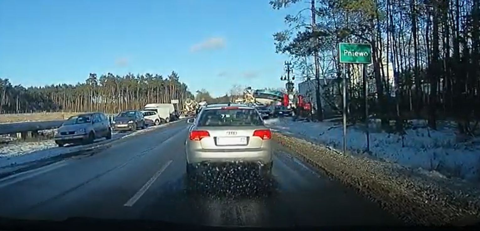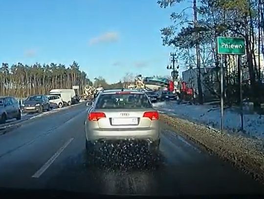 Zalegające błoto wywożone na kołach pojazdów z betoniarni, pojazdy parkujące na poboczu tuż przy krawędzi jezdni i ciężarowe auta blokujące przejazd - to bardzo poważne utrudnienia na tej trasie. Pamiętajmy, że ul. Przemysłowa na odcinku z Pniewa do Czarnowa nie ma oświetlenia, pobocza, żadnej ścieżki ani dla rowerów, ani dla pieszych, a poruszają się oni o świcie i po zmroku.