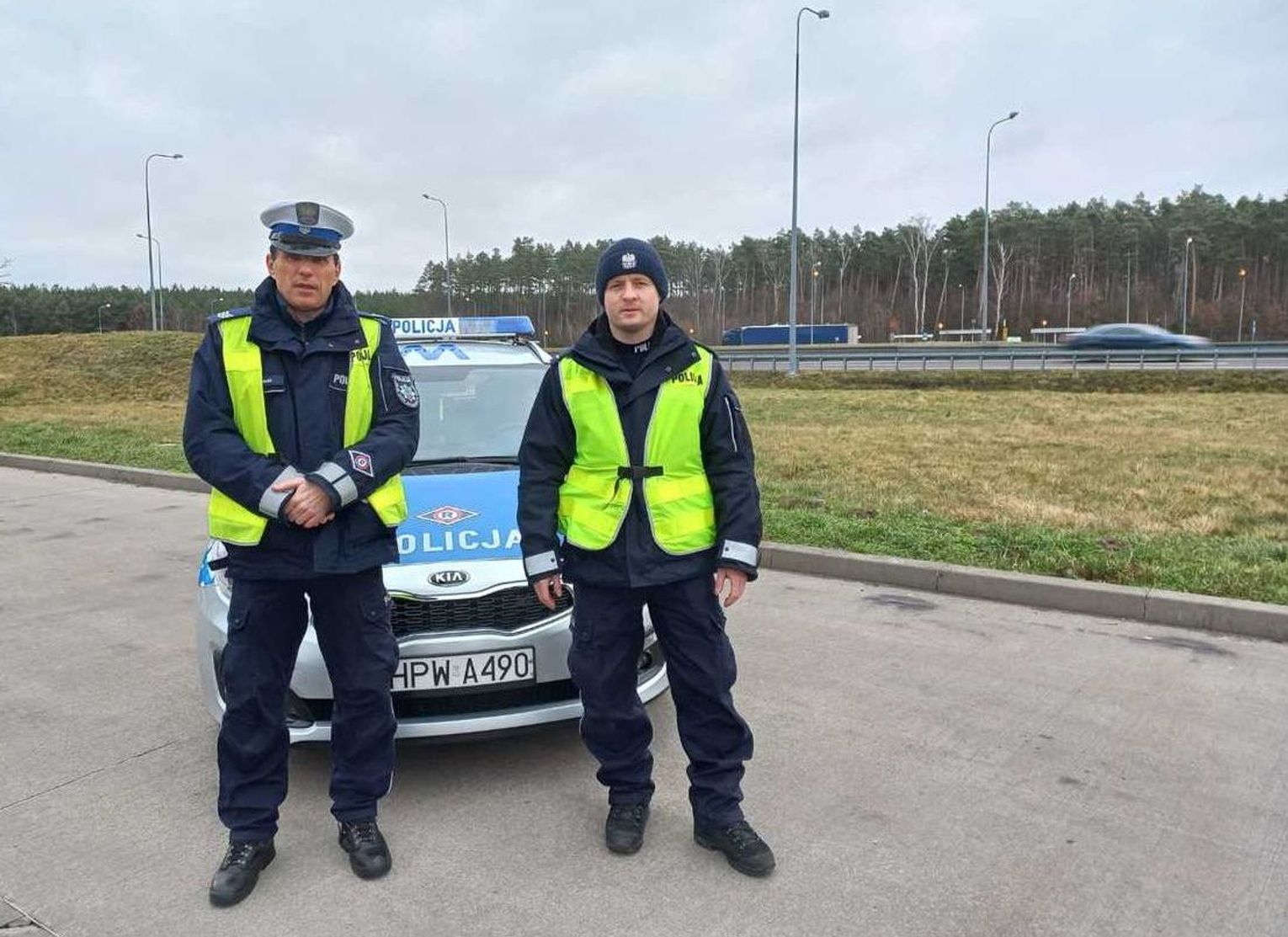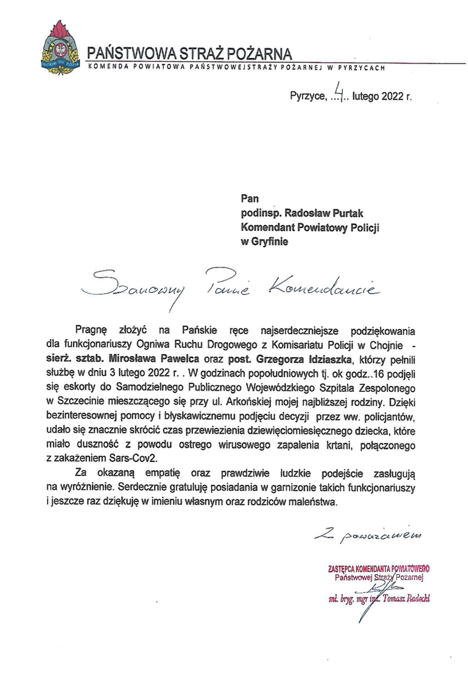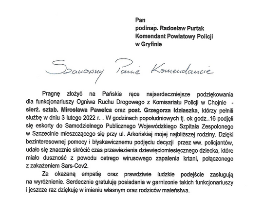 Za wzorową postawę policjantów Zespołu Ruchu Drogowego Komisariatu Policji w Chojnie, którzy 3 lutego 2022 r. pomogli w szybkim dotarciu do szpitala w Szczecinie, na ręce komendanta powiatowego policji w Gryfinie przyszły specjalne podziękowania.