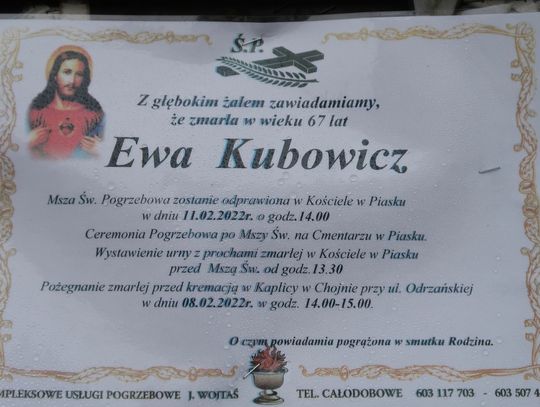 Msza św. pogrzebowa odprawiona zostanie 11 lutego 2022 r. o godz. 14.00 w kościele w Piasku.