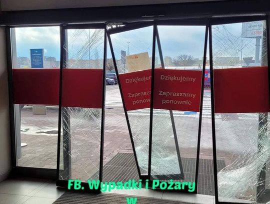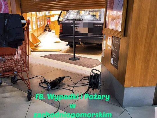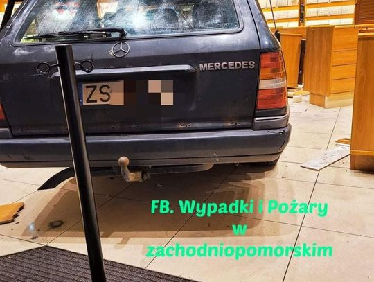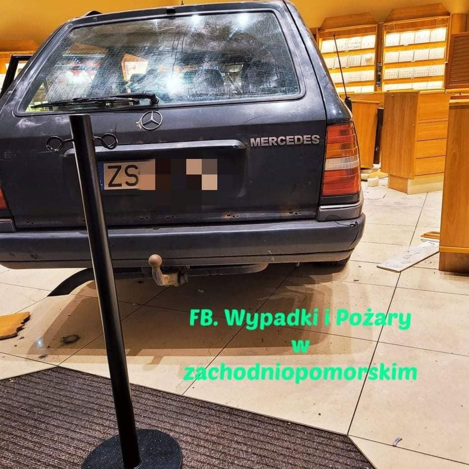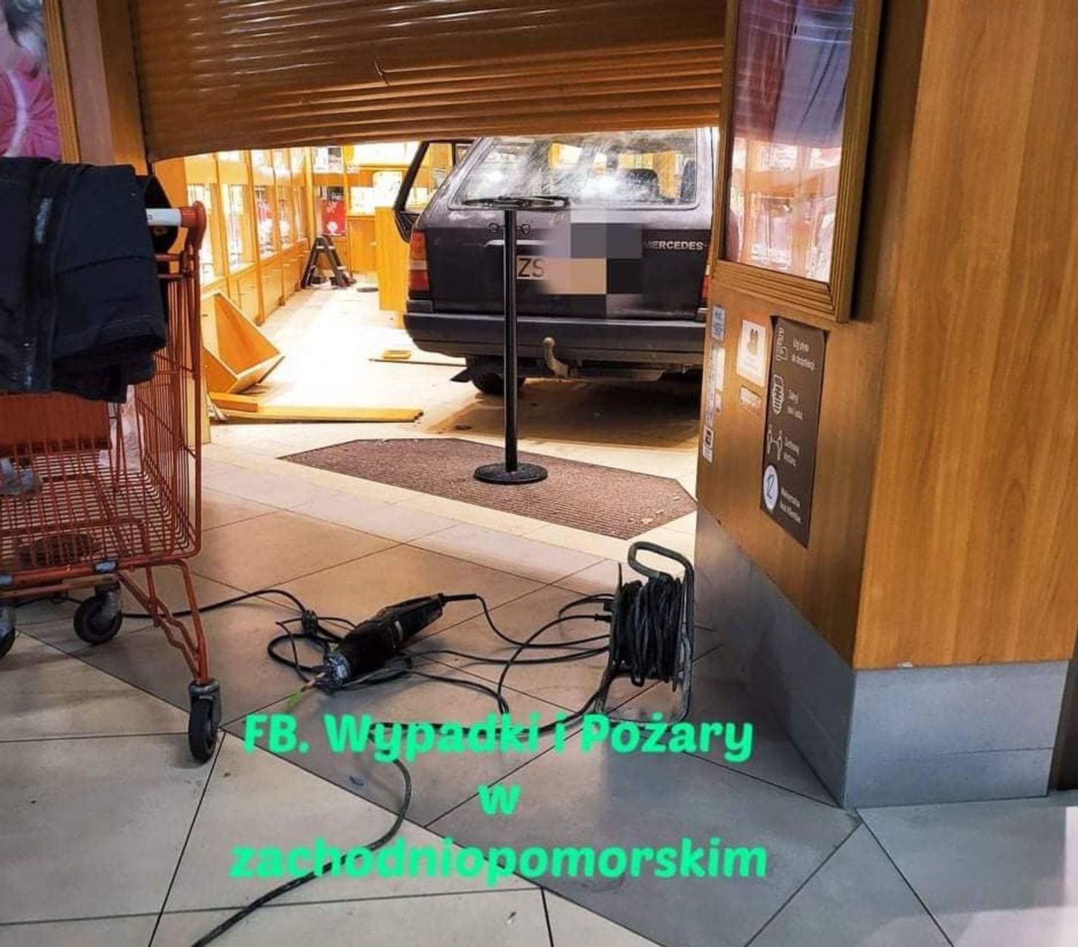 Sprawcy sforsowali drzwi galerii handlowej przy pomocy mercedesa skradzionego wcześniej.