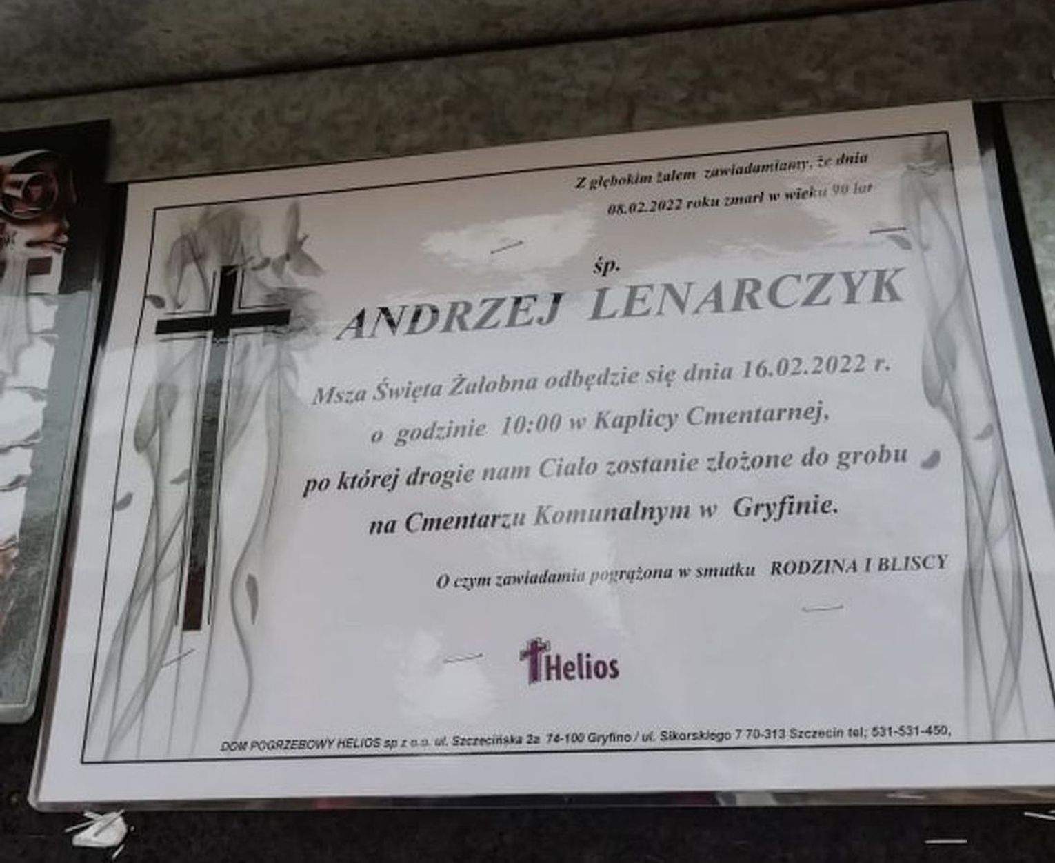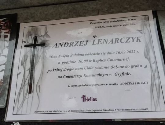 Msza św. żałobna odprawiona zostanie 16 lutego 2022 r. o godz. 10.00 w kaplicy cmentarnej w Gryfinie.
