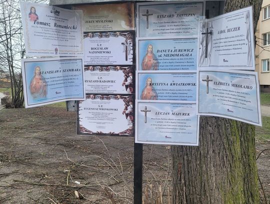 Na tablicach informacyjnych zamieszczono klepsydry z następującymi nazwiskami: