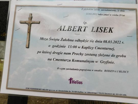 Msza św. żałobna odprawiona zostanie 8 marca 2022 r. o godz. 13.00 w kaplicy cmentarnej w Gryfinie.