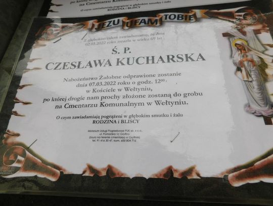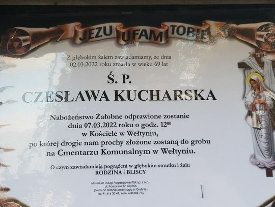 Nabożeństwo żałobne odprawione zostanie 7 marca 2022 r. o godz. 12.00 w kościele w Wełtyniu.