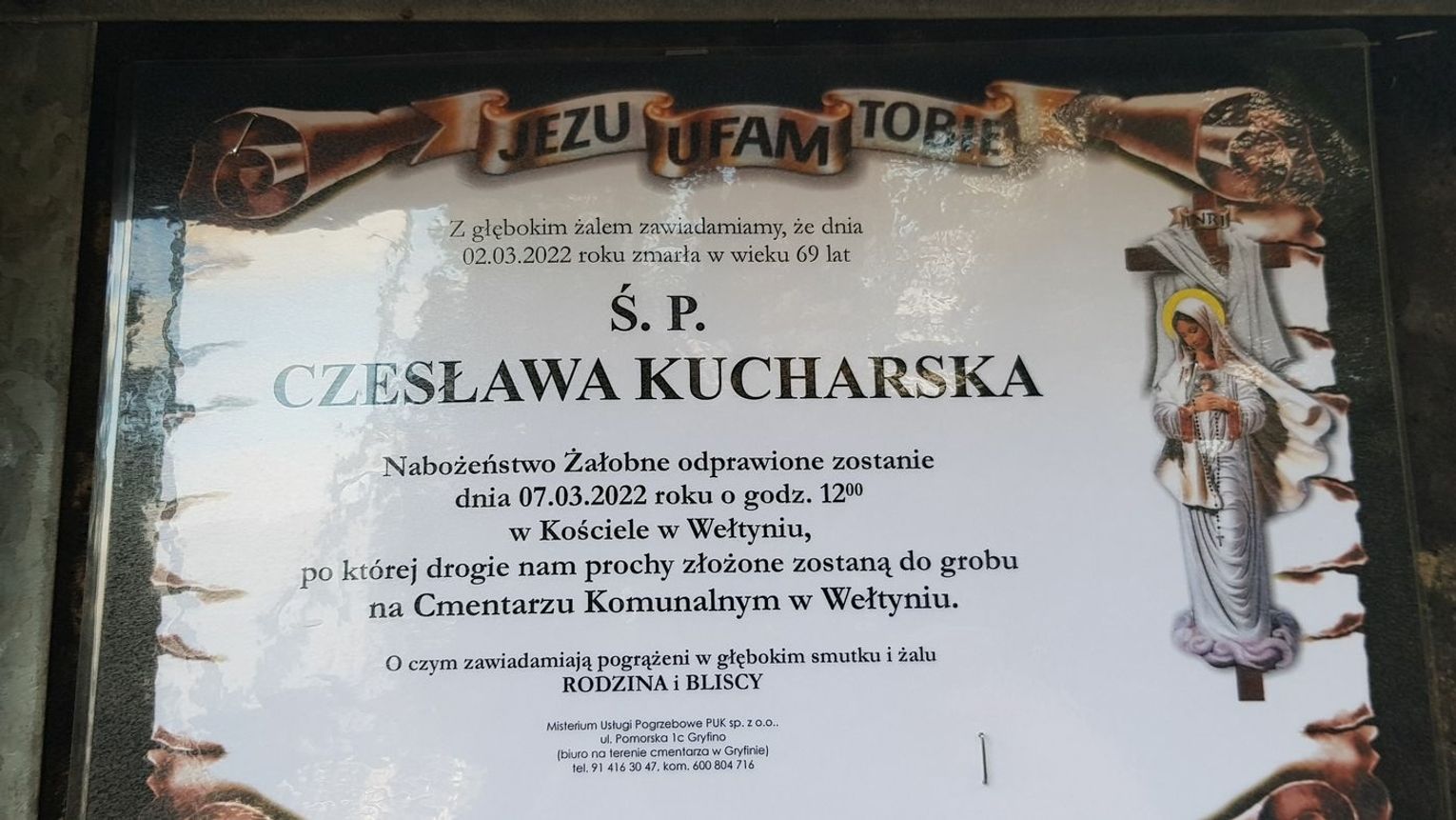 Prochy Zmarłej złożone zostaną do grobu na Cmentarzu Komunalnym w Wełtyniu.