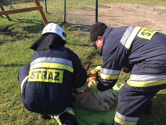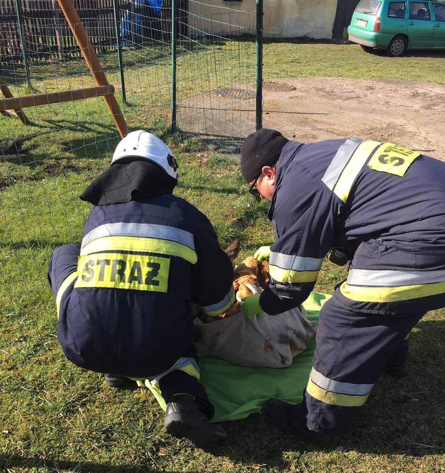 Zwierzę zaplątało się w ogrodzenie na terenie stacji kolejowej. Z pomocą ruszyli strażacy.