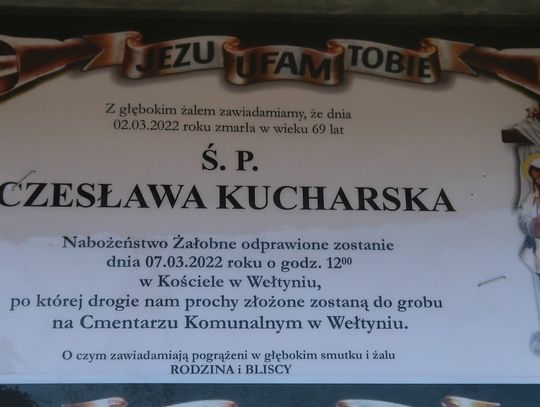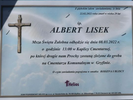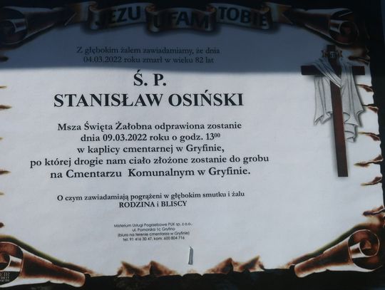 Msza św. żałobna odprawiona zostanie 9 marca 2022 r. o godz. 13.00 w kaplicy cmentarnej w Gryfinie.