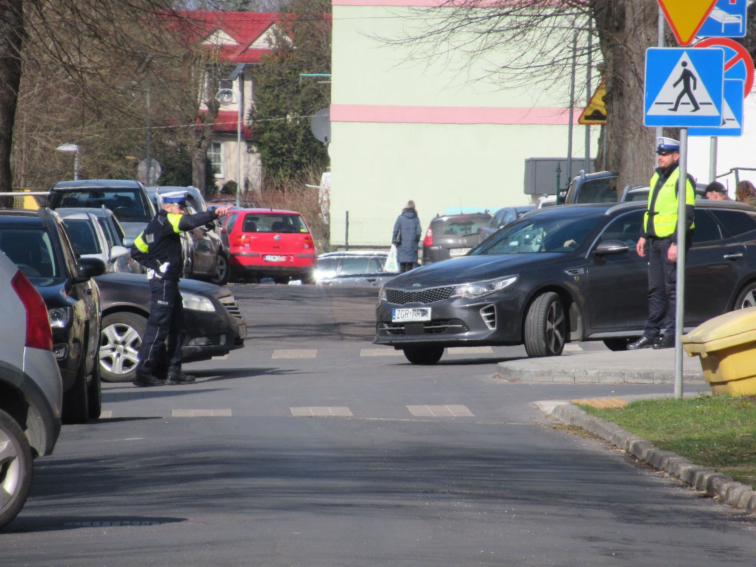 Na zdjęciu chwila, kiedy policjanci zabezpieczali ul. Parkową, ponieważ wielki samochód ciężarowy nie miał szans przejechać ul. Niepodległości. TIR z Holandii przywiózł dary do powiatowego magazynu centralnego zorganizowanego właśnie w LO przy ul. Niepodległości.