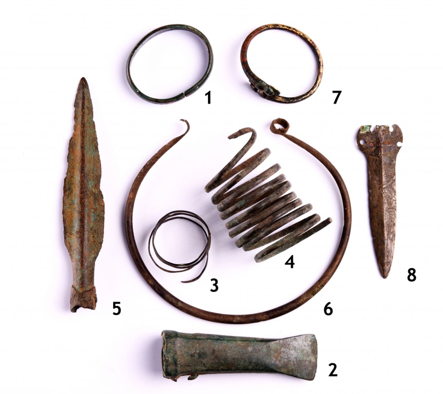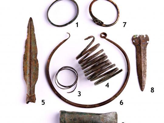5, 6 – grot oszczepu i naszyjnik z brązu z depozytu odkrytego w miejscowości Będargowo