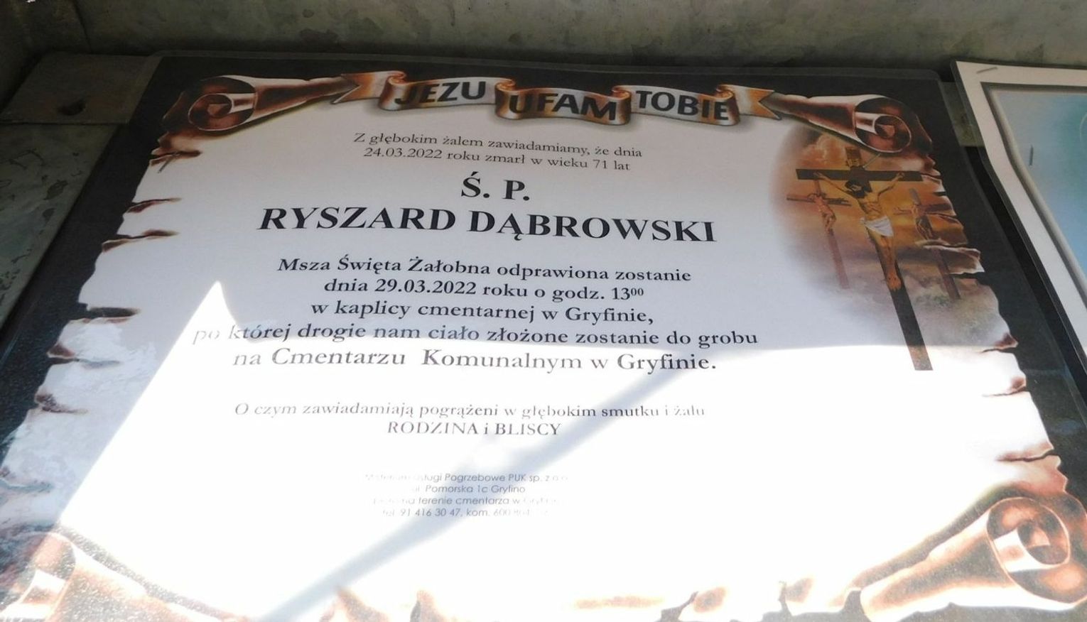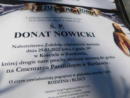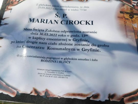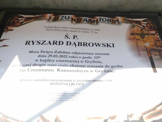Msza św. żałobna odprawiona zostanie 30 marca 2022 r. o godz. 10.00 w kaplicy cmentarnej w Gryfinie.