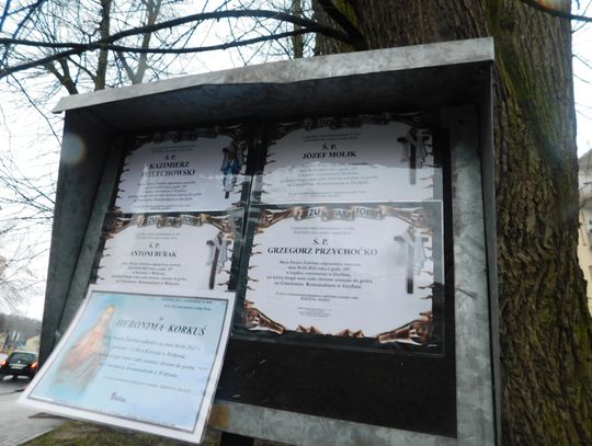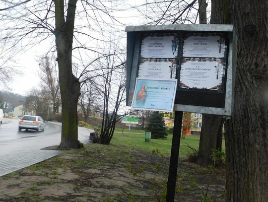 Na tablicach informacyjnych zamieszczono klepsydry z następującymi nazwiskami: