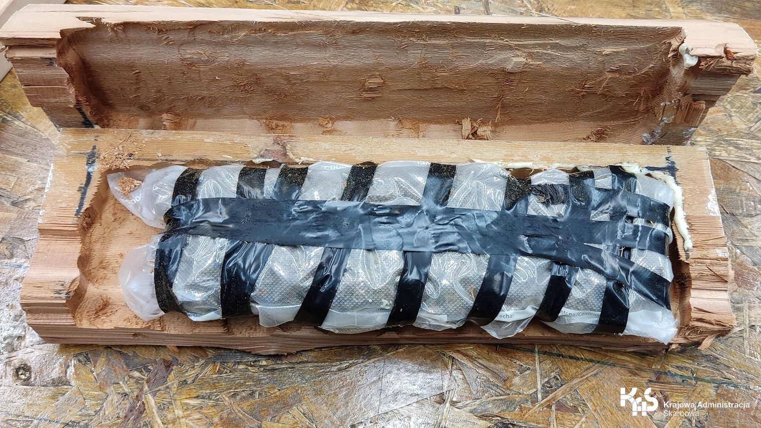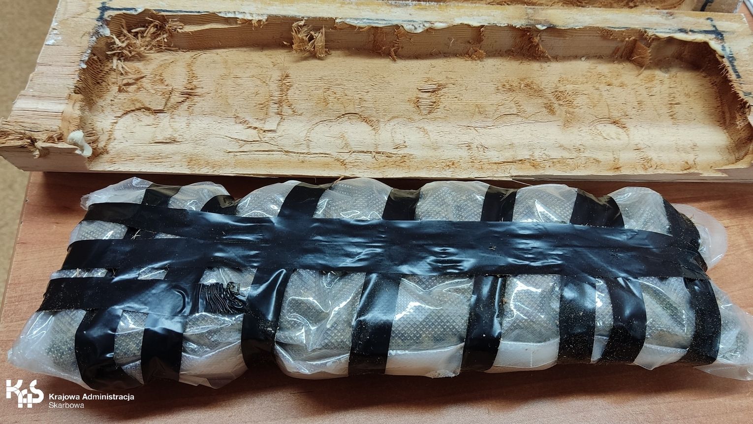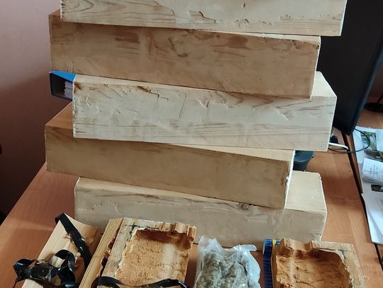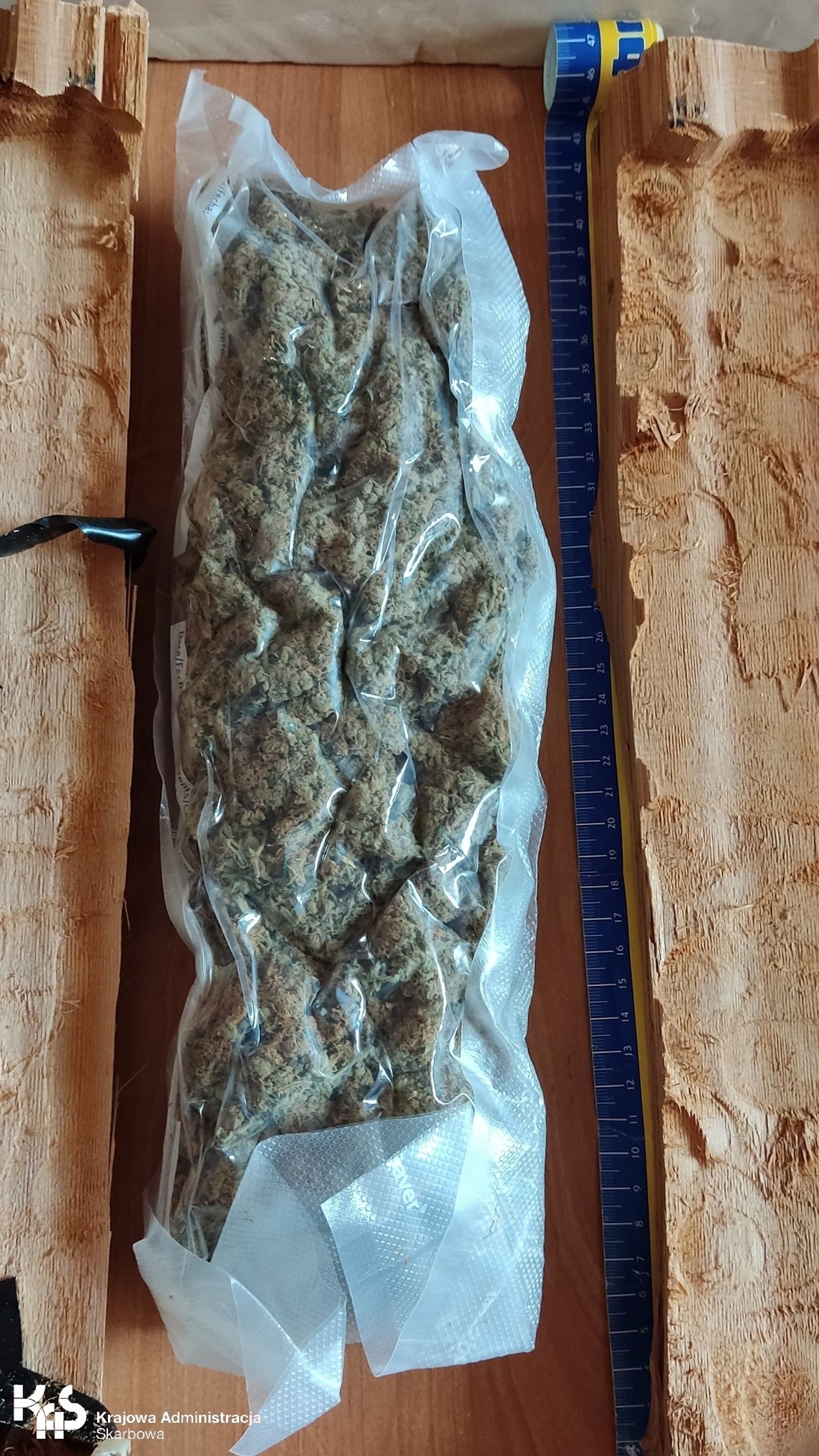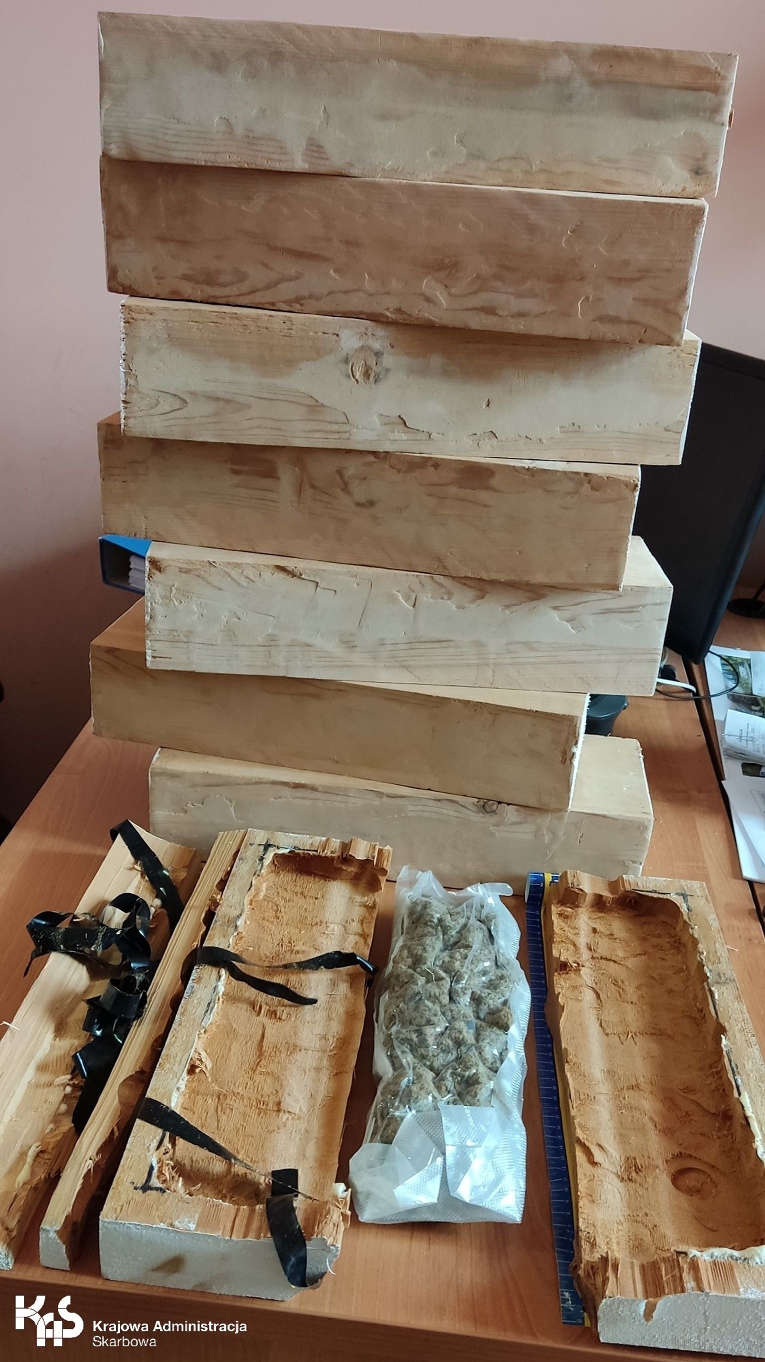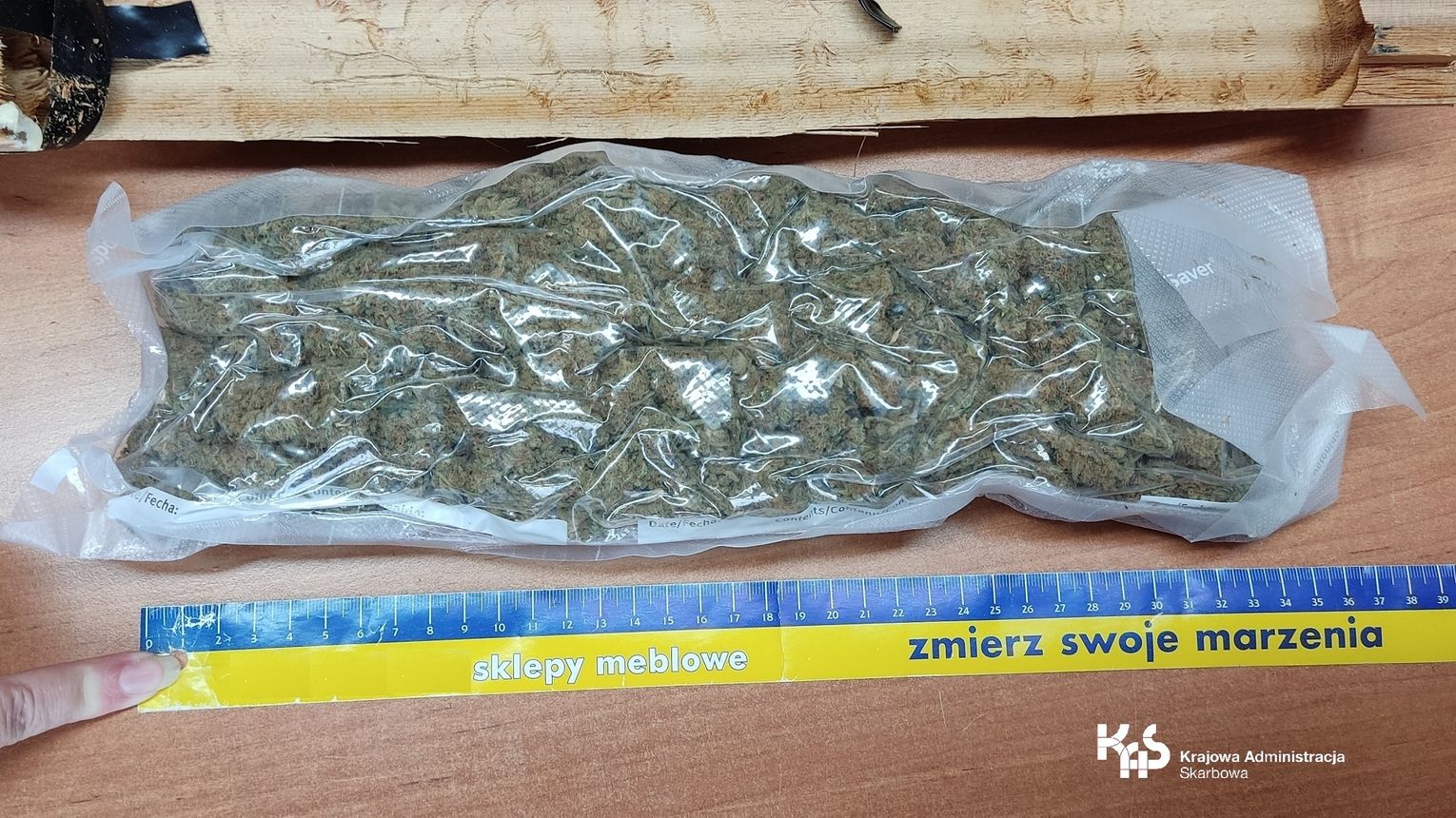 Po otwarciu kartonu funkcjonariusze wyczuli intensywny, charakterystyczny zapach, przypominający zapach konopny. Po otwarciu jednego z drewnianych elementów zauważono wydrążoną przestrzeń w której znajdował się pakunek owinięty folią i taśmą izolacyjną o wadze 215 gramów.