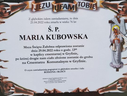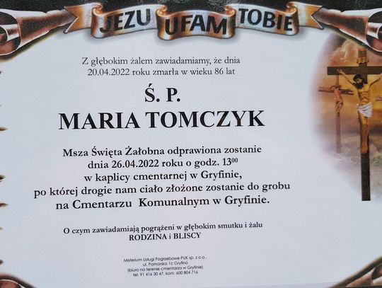 Msza św. żałobna odprawiona zostanie 26 kwietnia 2022 r. o godz. 13.00 w kaplicy cmentarnej w Gryfinie.