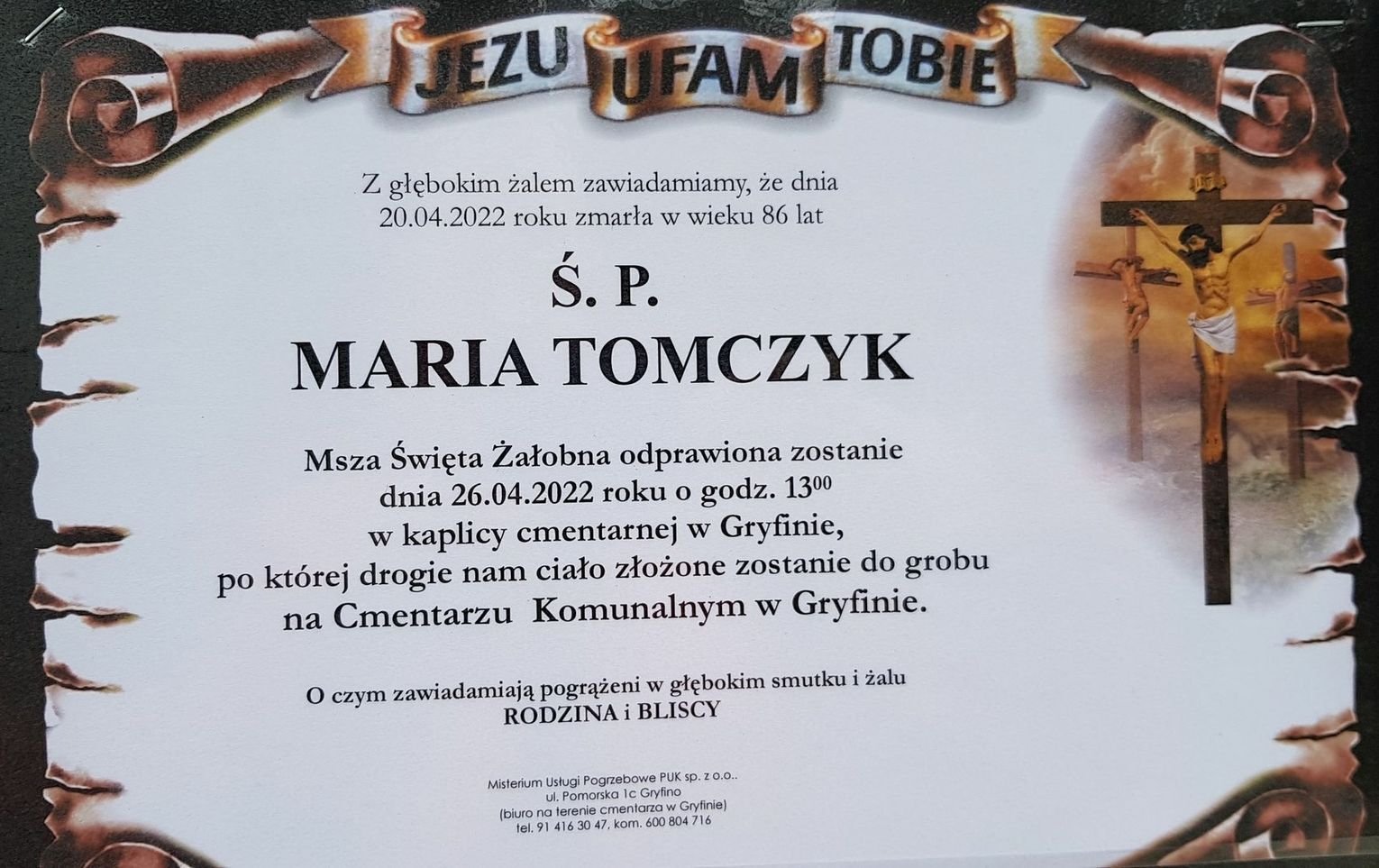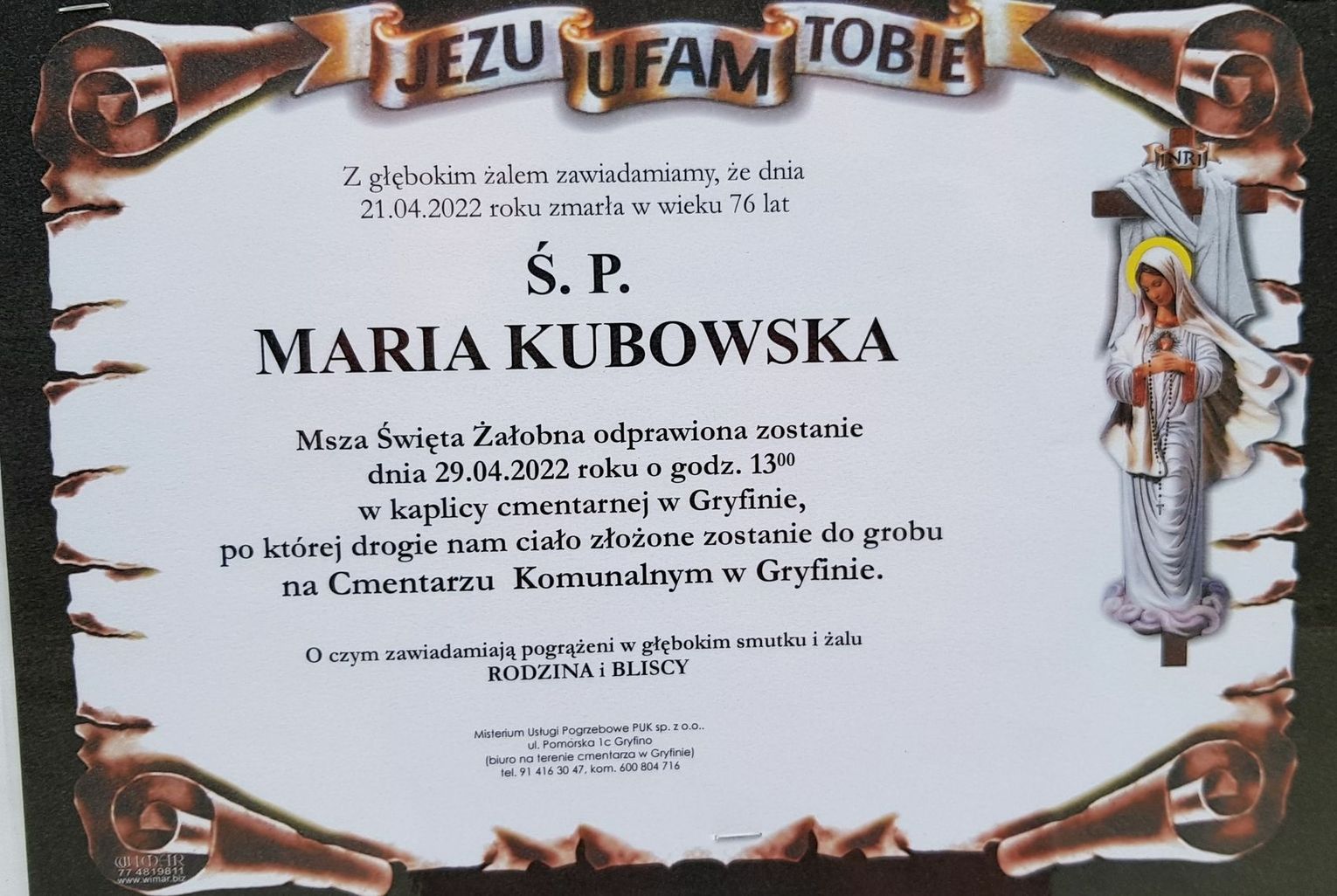 Msza św. żałobna odprawiona zostanie 25 kwietnia 2022 r. o godz. 13.00 w kaplicy cmentarnej w Gryfinie.