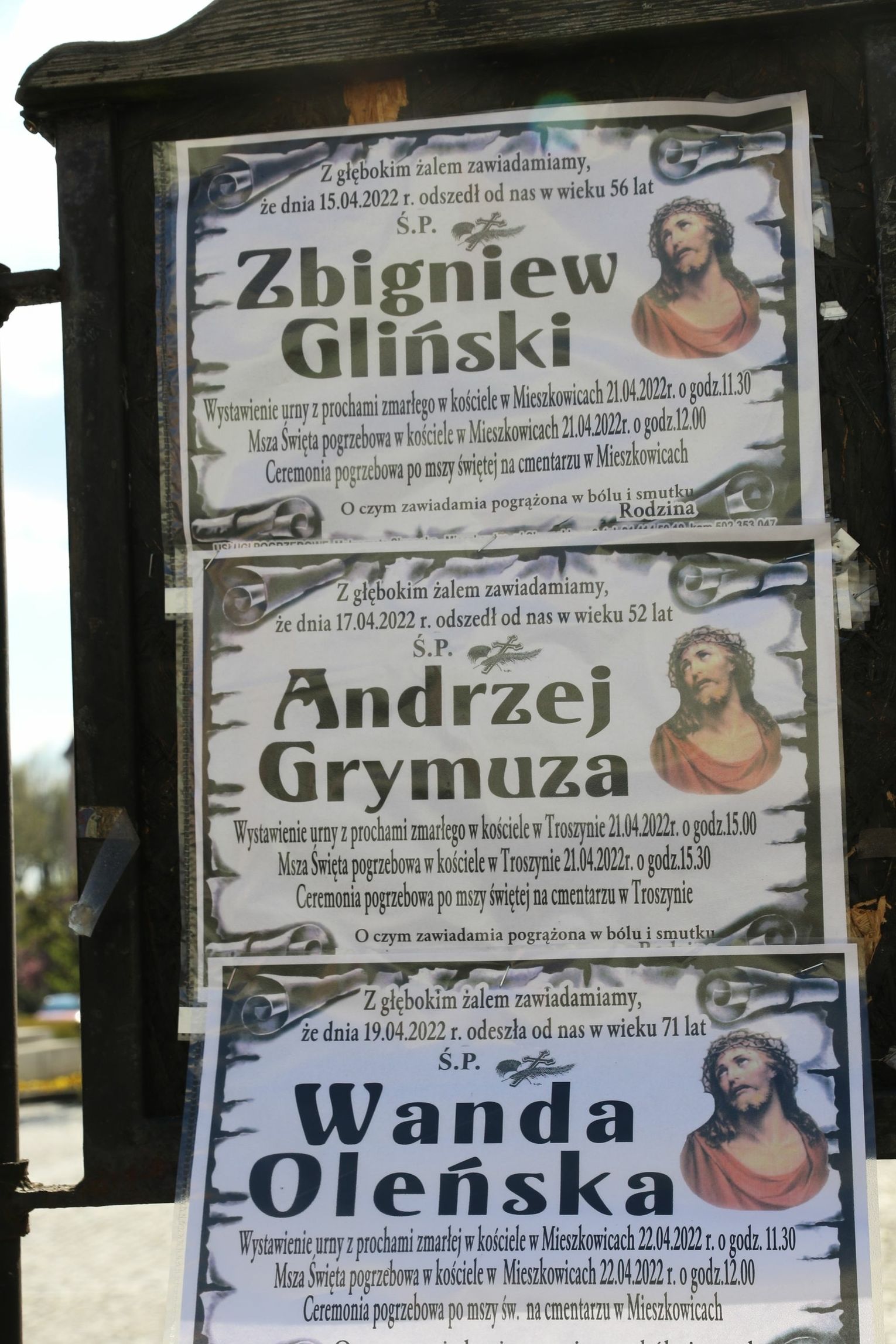 Na tablicach informacyjnych zamieszczono klepsydry z następującymi nazwiskami: