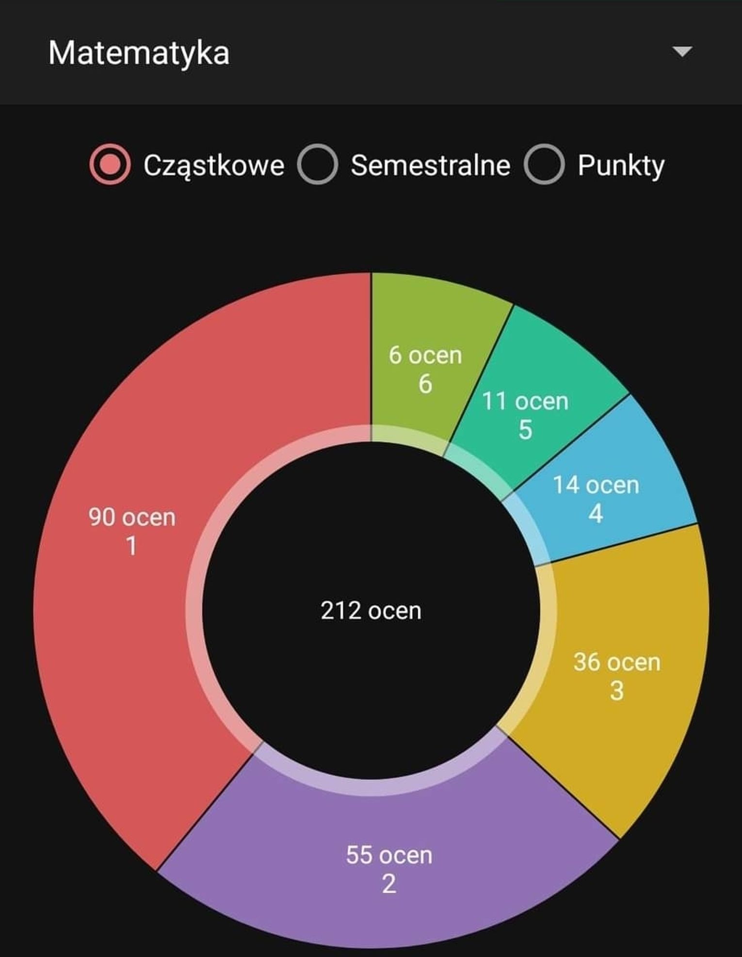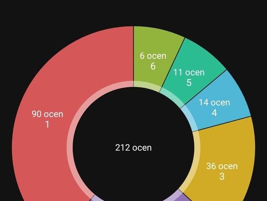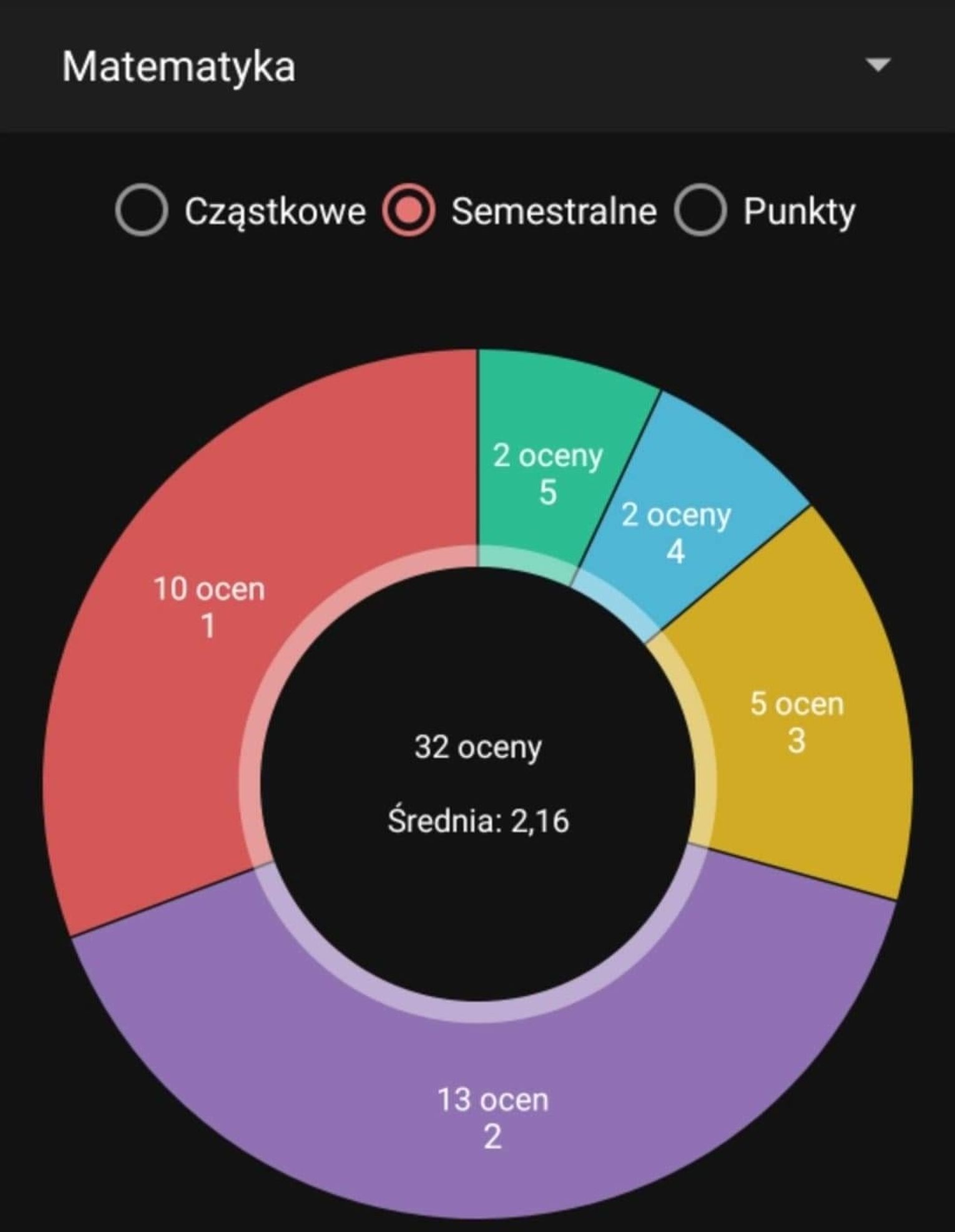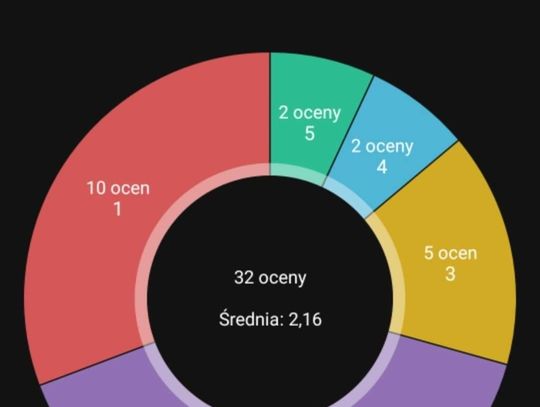 Diagram kołowy czytelnie ukazuje, że blisko 72% uczniom danej grupy zostały wystawione oceny niedostateczne i dopuszczające. Natomiast na drugim końcu są osoby z ocenami dobrymi i bardzo dobrymi, które stanowią tylko 12,5%. Gołym okiem można dostrzec przerażającą skalę skrajności, a także poziom przekazywania wiedzy przez nauczycielkę. Średnia ocen danej grupy jest przerażająco niska i wynosi 2,16.