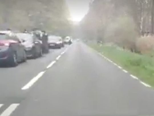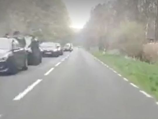 Na południu powiatu funkcjonariusze Komendy Wojewódzkiej Policji prowadzą akcje. Zatrzymują samochody osobowe, które przechodzą rewizję. Ruch odbywa się jednym pasem i jest sterowany ręcznie przez drogówkę.