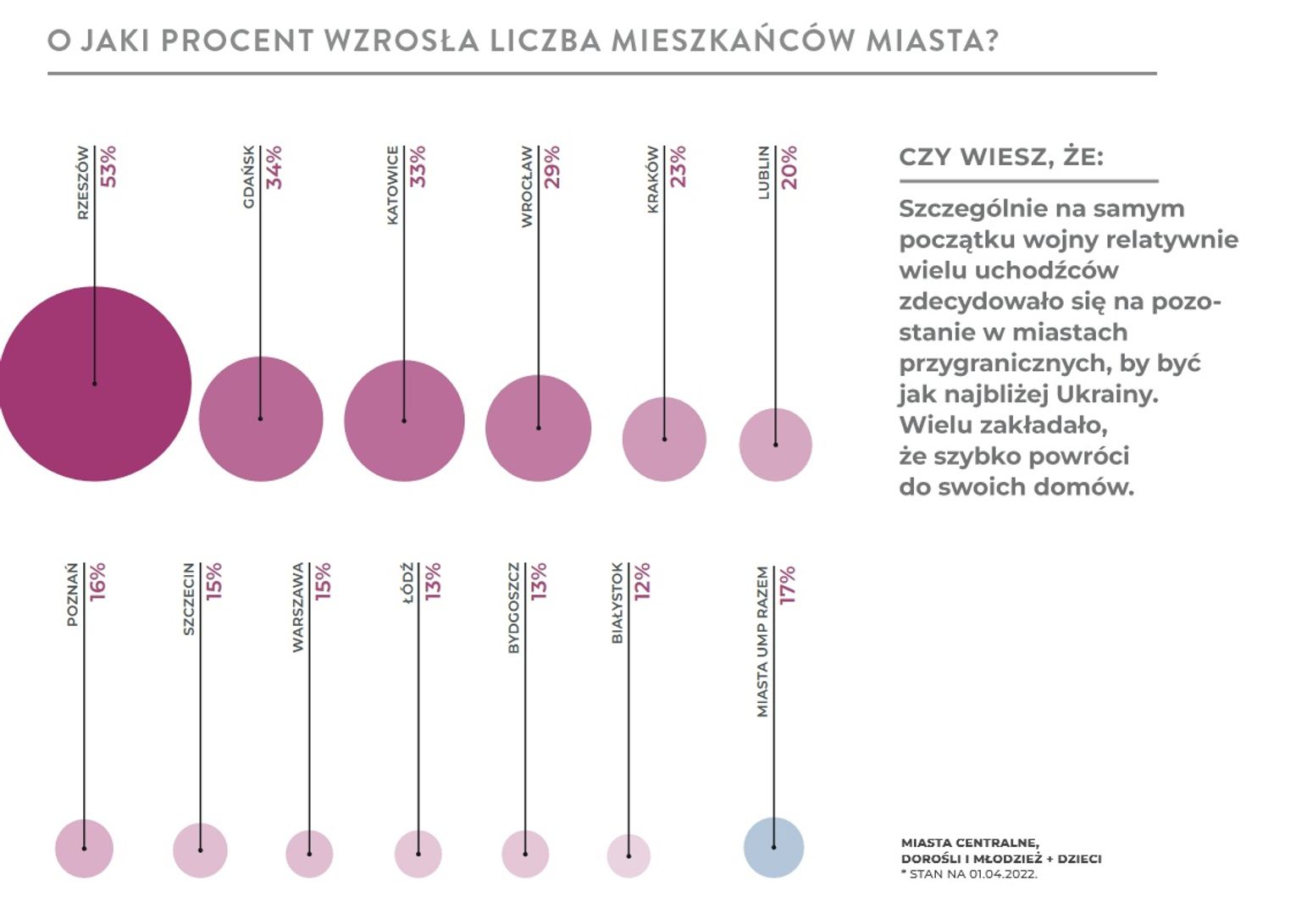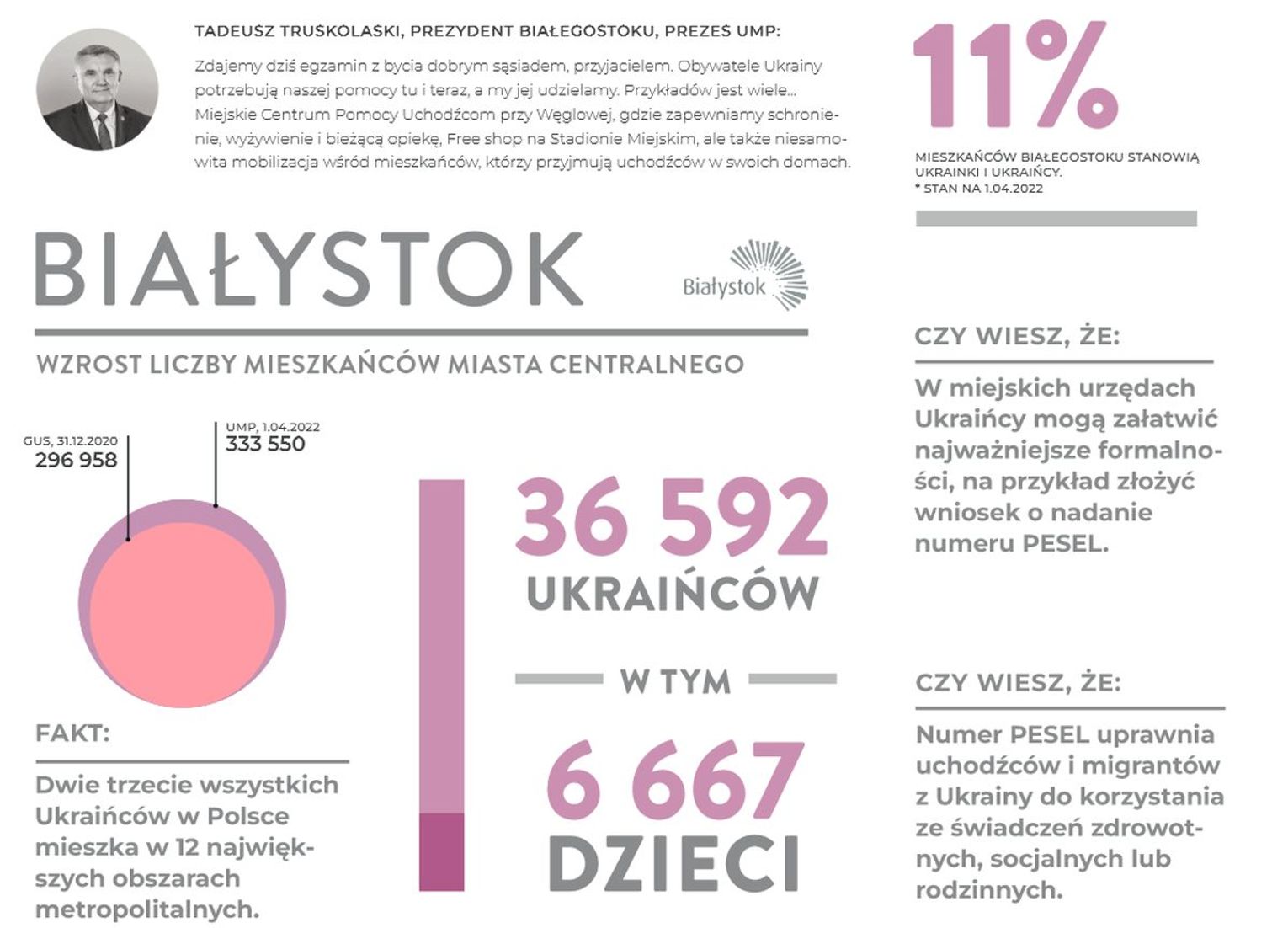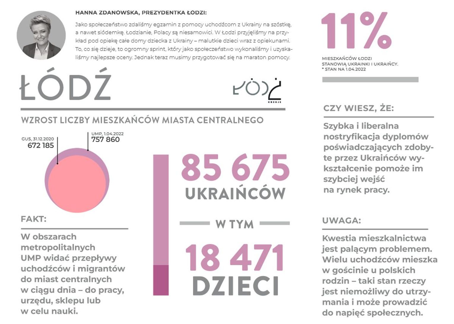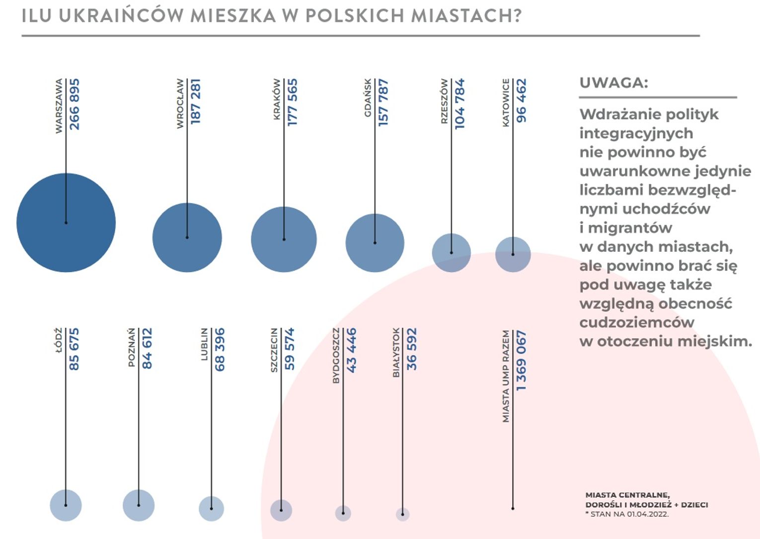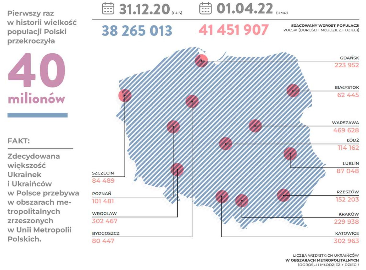 W marcu 2022 zrzeszone w UMP miasta i otaczające je gminy gościły prawie 70 proc. (ponad 2 miliony 200 tysięcy osób) spośród wszystkich obywateli Ukrainy, którzy mieszkają obecnie w Polsce (tzn. którzy przyjechali do Polski po 24 lutego i którzy mieszkali tu wcześniej). Oznacza to skokowy wzrost populacji największych polskich miast” – raportuje UMP.