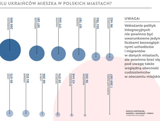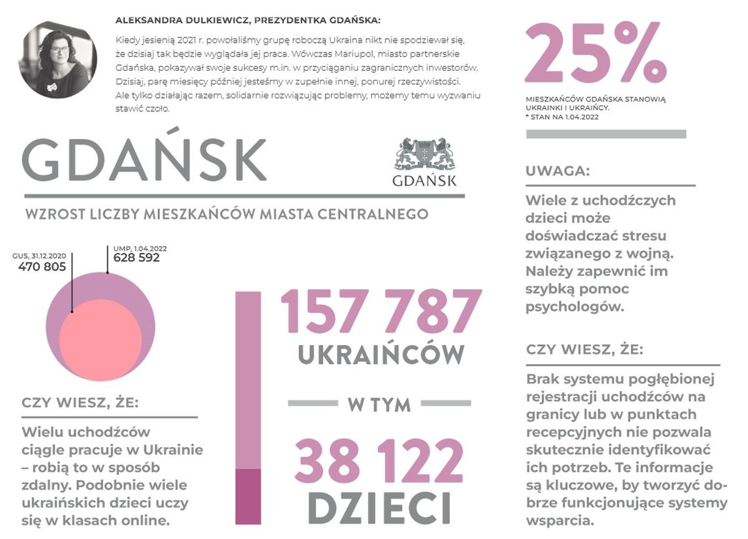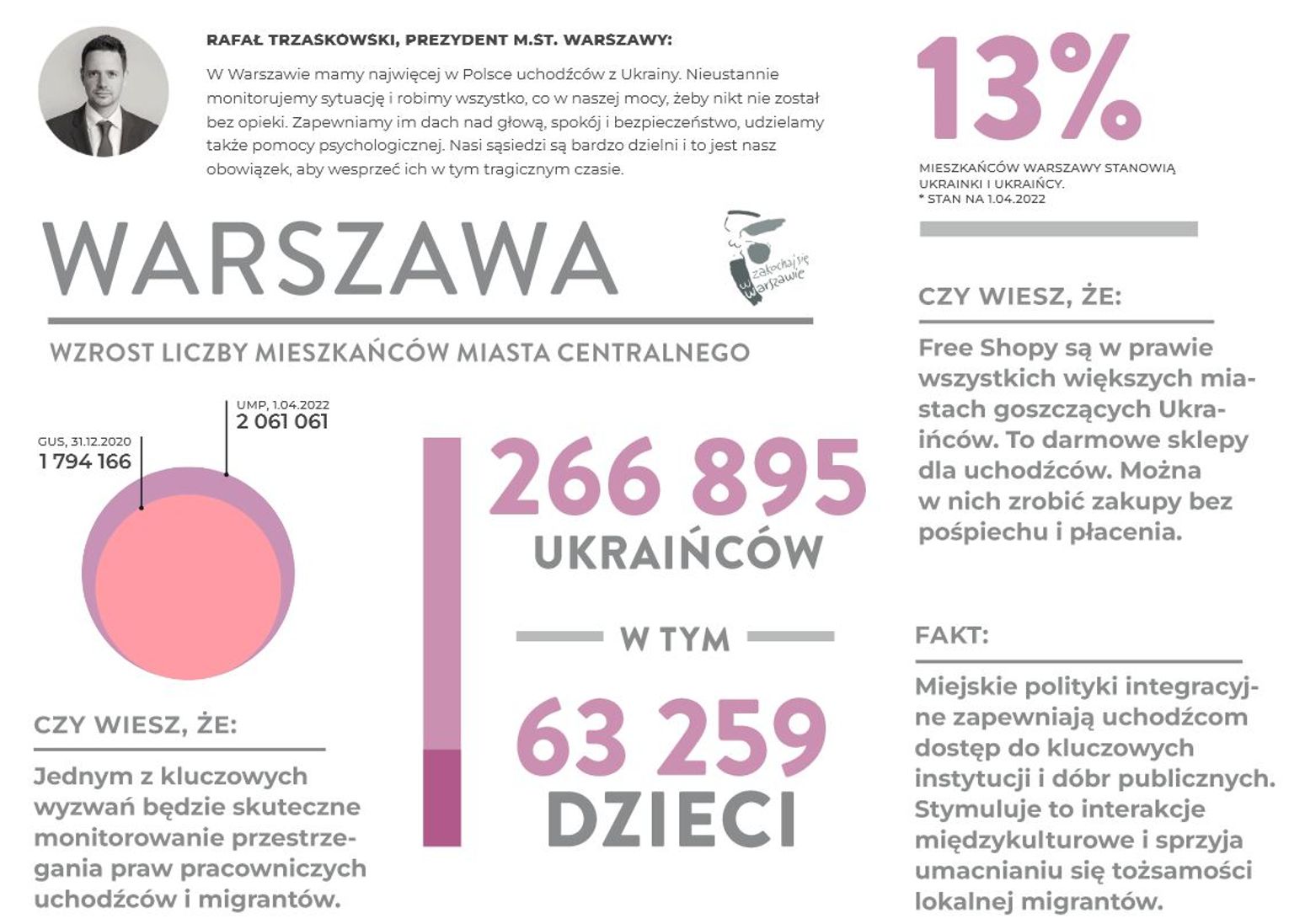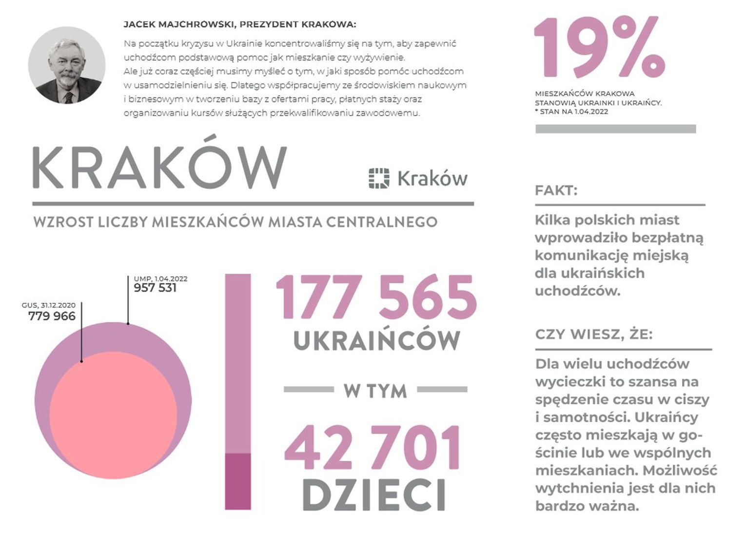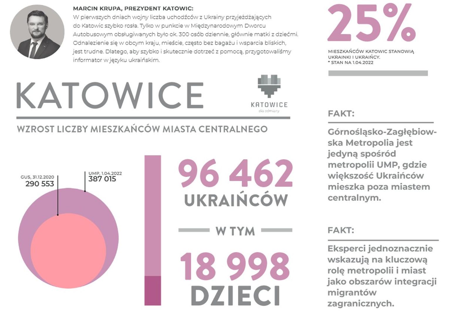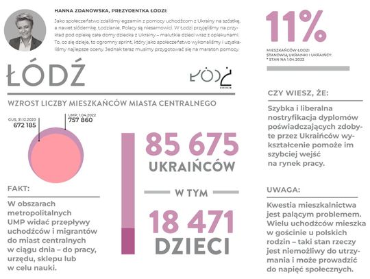 W marcu 2022 zrzeszone w UMP miasta i otaczające je gminy gościły prawie 70 proc. (ponad 2 miliony 200 tysięcy osób) spośród wszystkich obywateli Ukrainy, którzy mieszkają obecnie w Polsce (tzn. którzy przyjechali do Polski po 24 lutego i którzy mieszkali tu wcześniej). Oznacza to skokowy wzrost populacji największych polskich miast” – raportuje UMP.