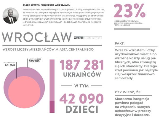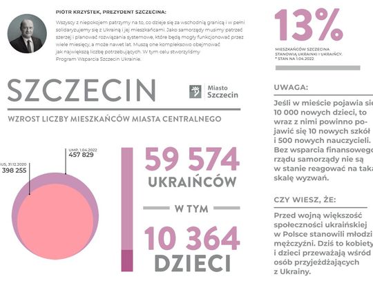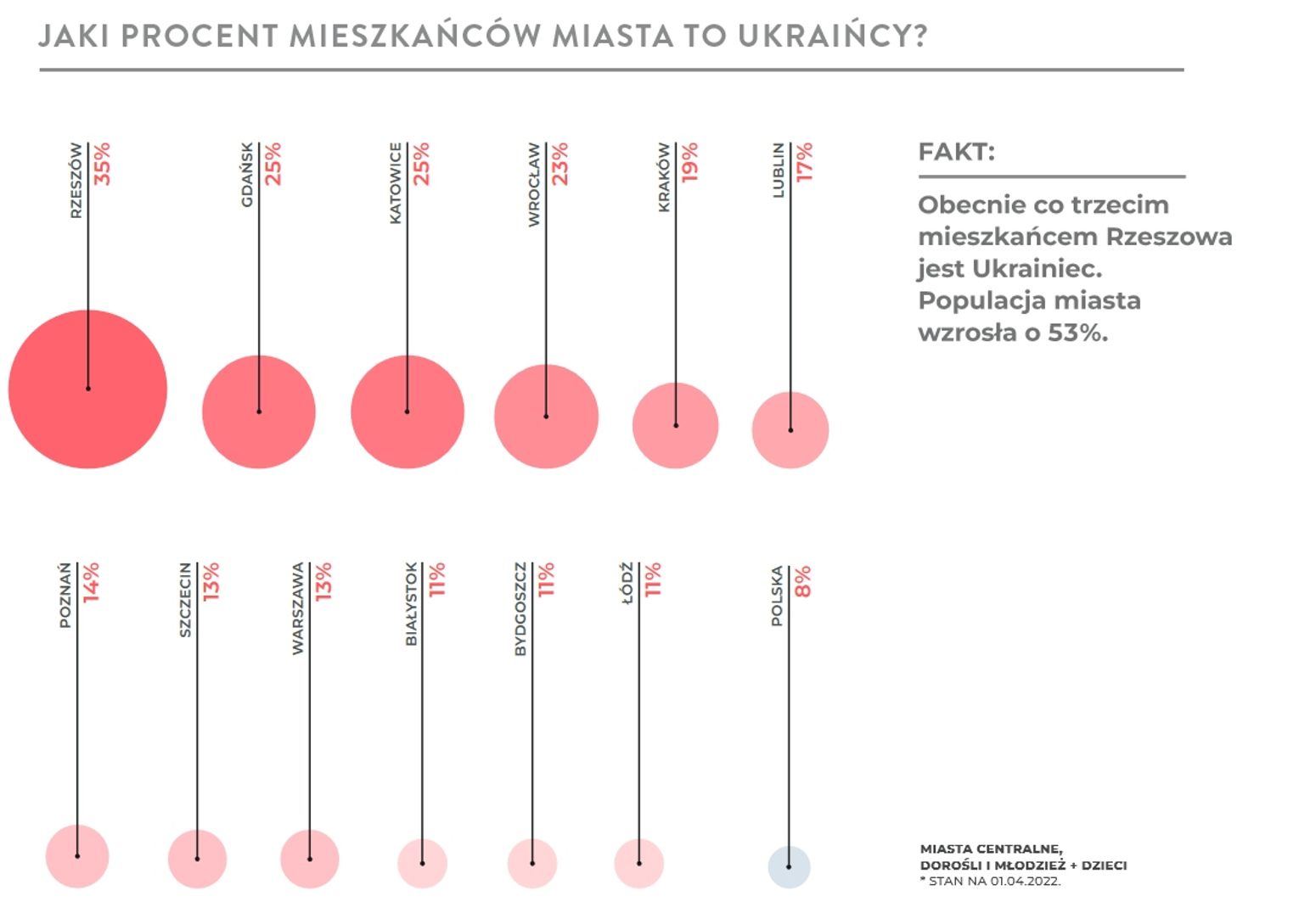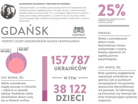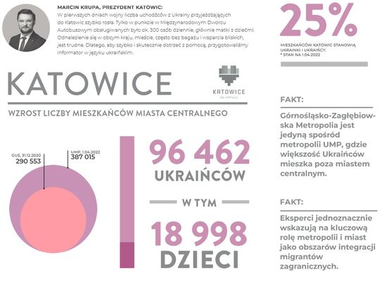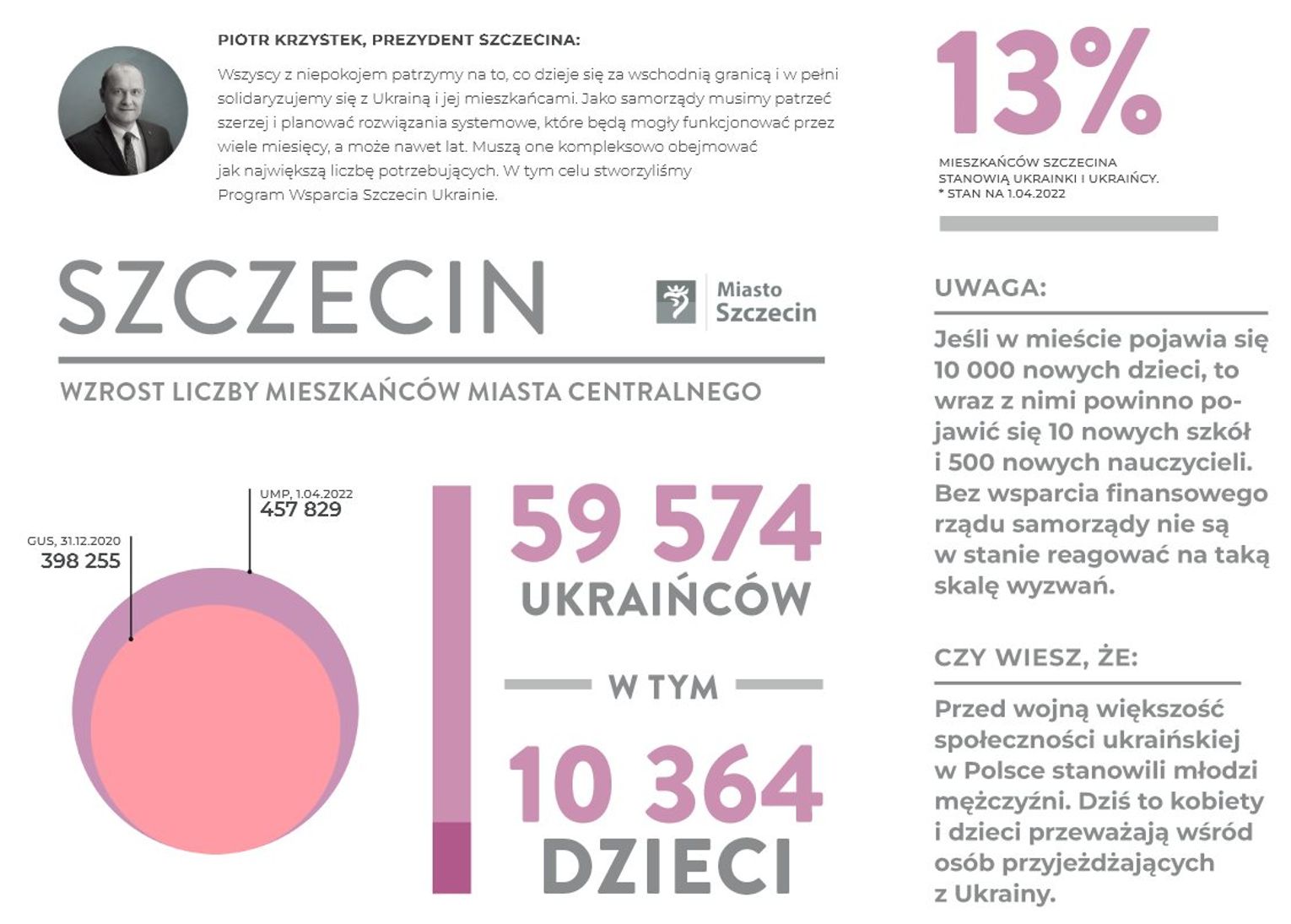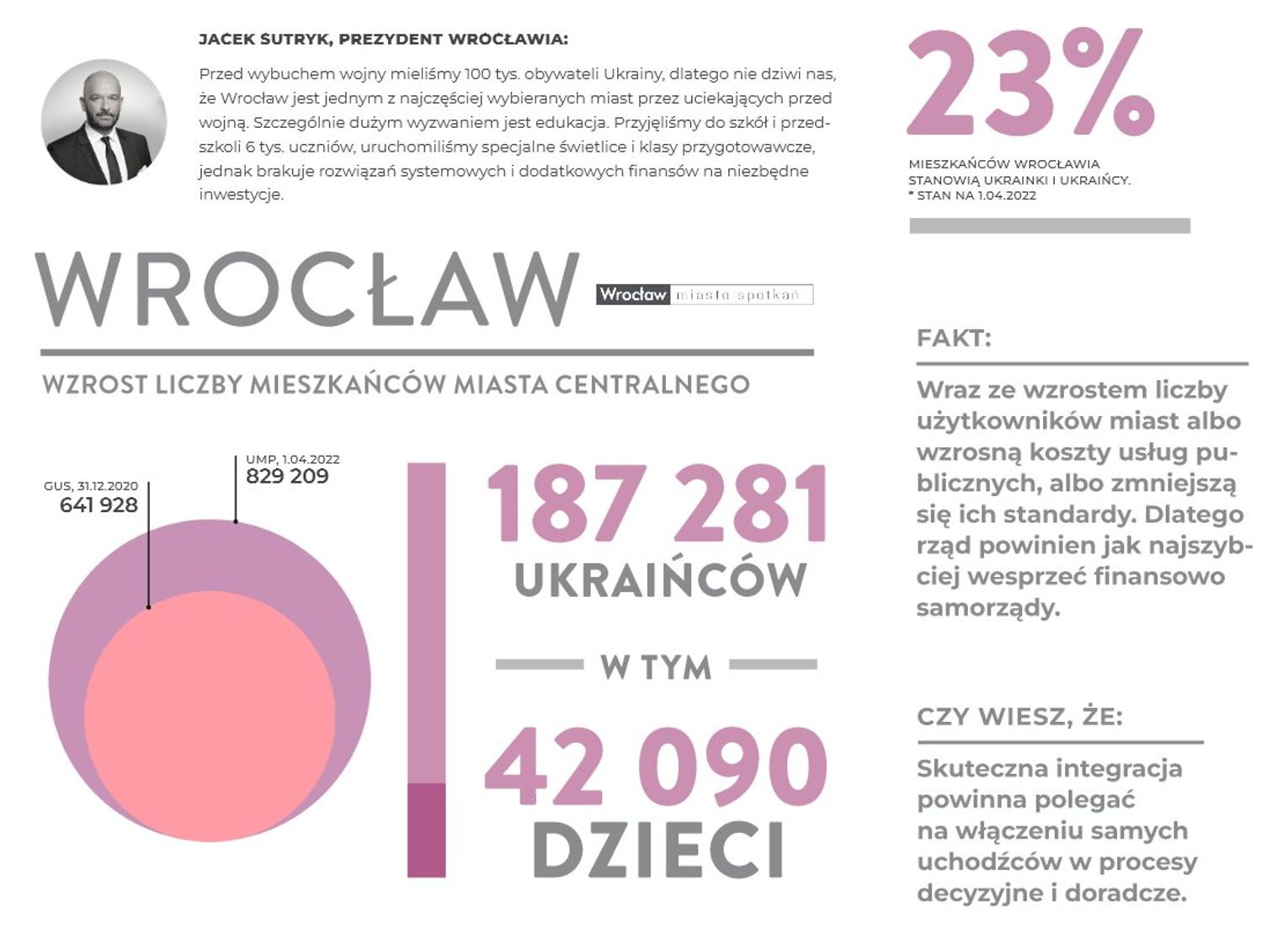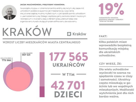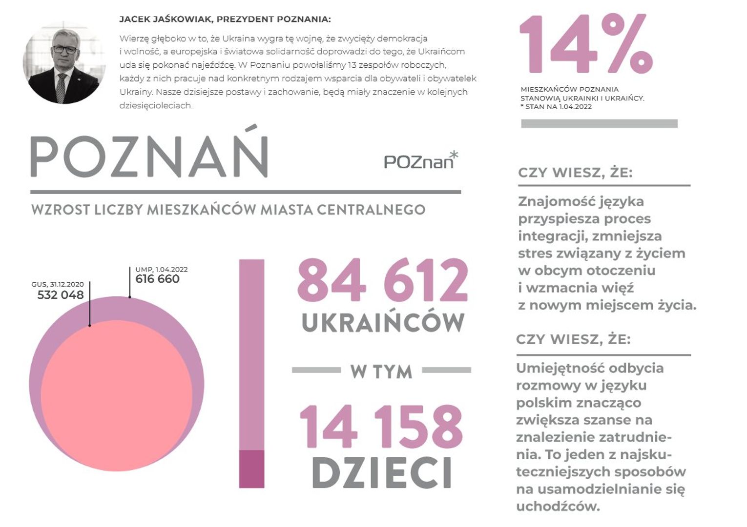 W marcu 2022 zrzeszone w UMP miasta i otaczające je gminy gościły prawie 70 proc. (ponad 2 miliony 200 tysięcy osób) spośród wszystkich obywateli Ukrainy, którzy mieszkają obecnie w Polsce (tzn. którzy przyjechali do Polski po 24 lutego i którzy mieszkali tu wcześniej). Oznacza to skokowy wzrost populacji największych polskich miast” – raportuje UMP.