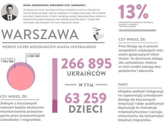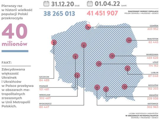 „Zebrane dane dotyczą okresu między 1 lutego a 1 kwietnia 2022 r. Wskazują one na skokowy wzrost populacji Polski, która pierwszy raz w historii osiągnęła ponad 40 milionów osób (prawie 41 i pół miliona), a także na kluczową rolę samorządów w przyjmowaniu ukraińskich uchodźców i uchodźczyń.