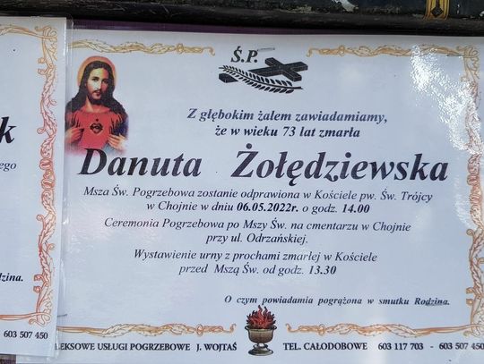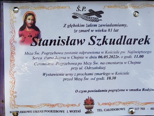 Msza św. pogrzebowa odprawiona zostanie 6 maja 2022 r. o godz. 11.00 w kościele pw. Najświętszego Serca Pana Jezusa w Chojnie.