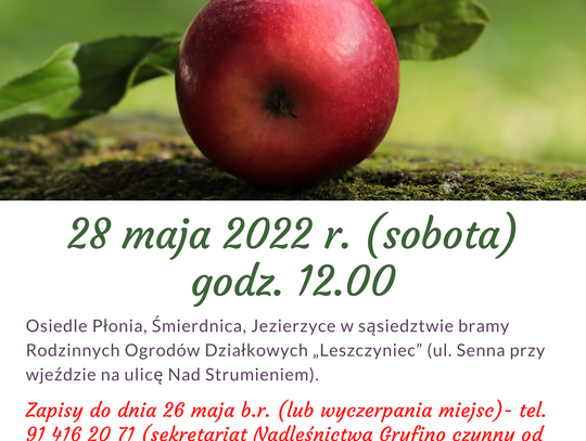 Wspólne sadzenie odbędzie 28 maja 2022 r. (sobota) od godz. 12.00 na osiedlu Płonia, Śmierdnica, Jezierzyce w sąsiedztwie bramy Rodzinnych Ogrodów Działkowych „Leszczyniec” (ul. Senna przy wjeździe na ulicę Nad Strumieniem). Zakończenie spotkania około godziny 15.00.
