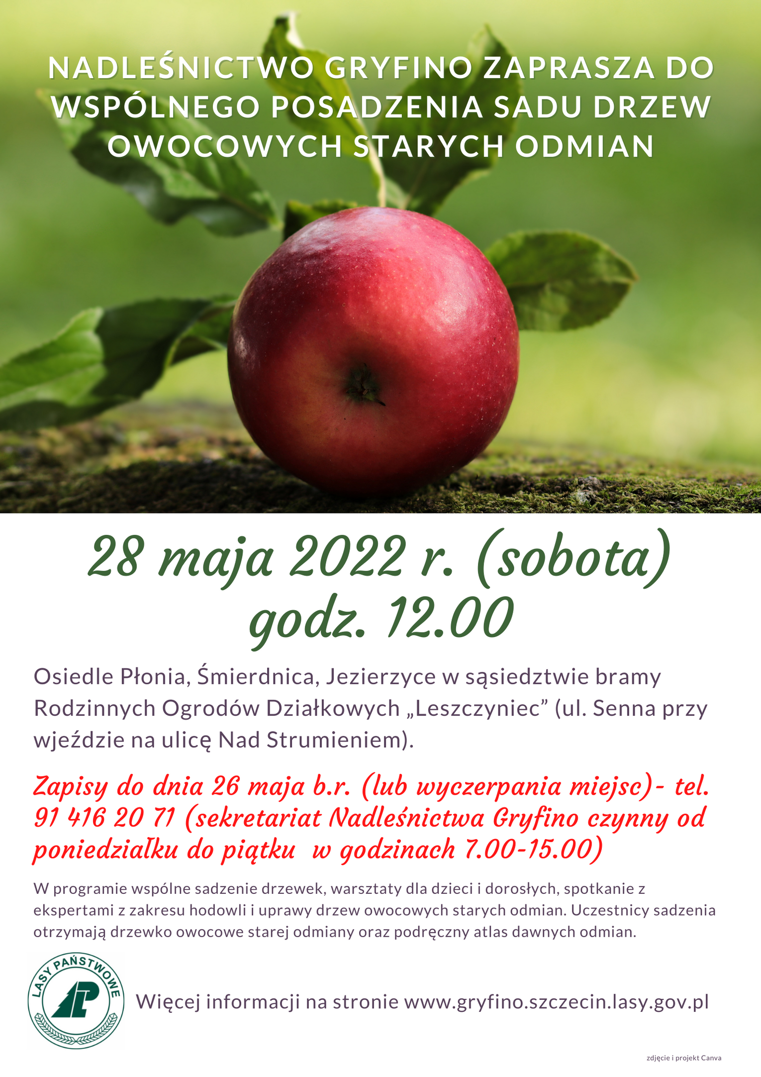 Nowa powierzchnia z drzewami owocowymi jest kontynuacją projektu „Zakładamy sady”, rozpoczętego wspólnie z Centrum Informacyjnym Lasów Państwowych i Lubuskim Centrum Starych Odmian Drzew Owocowych. Pierwszy z sadów, złożony ze starych odmian jabłoni powstał w czerwcu 2021 r. na gruntach nadleśnictwa, w sąsiedztwie szlaku rowerowego Blue Velo w Małym Borzymku. Projekt był kontynuowany jesienią 2021 r. poprzez akcję „Przerwa na owoc”, polegającą na przekazaniu drzewka placówkom oświatowym i domom pomocy społecznej z terenu gminy Gryfino w celu założenia „mini sadów” przy ich placówkach.