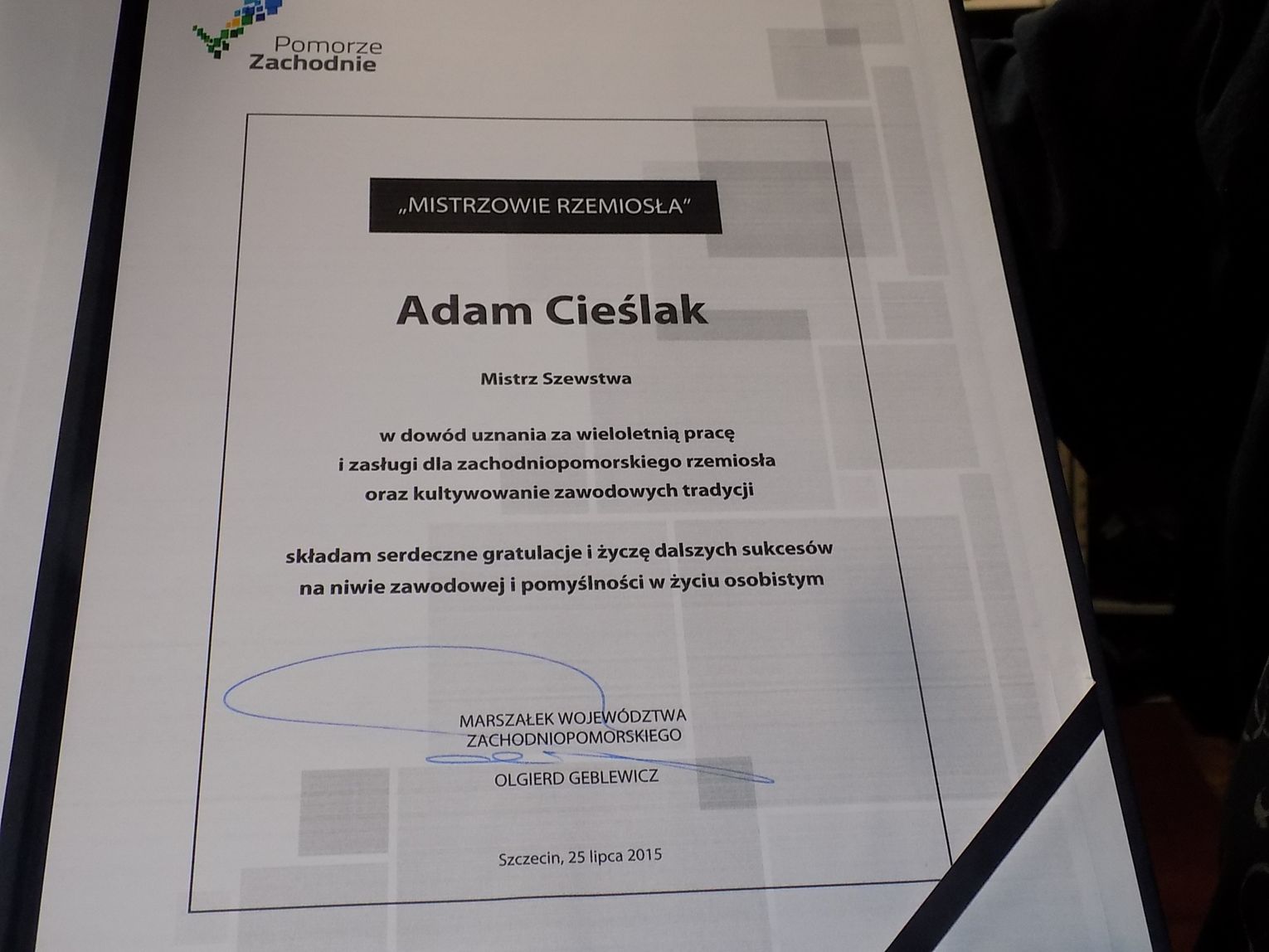 Nikomu w Gryfinie nie trzeba przedstawiać szewca – pana Adama. Jego osiągnięcia i praca oraz zaangażowanie znane są gryfiniakom. Ma czas pożartować i porozmawiać. Uważa, że w szczerej rozmowie poznaje się człowieka. A ludzie mają zaufanie do pana Adama i niejeden sekret na ucho zdradzają. Mistrz lubi rozmawiać z ludźmi. Myśli pozytywnie i ta dobra energia udziela się każdemu zaglądającemu do zakładu. I tak przez wiele lat.