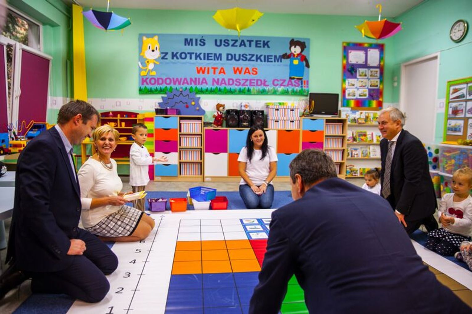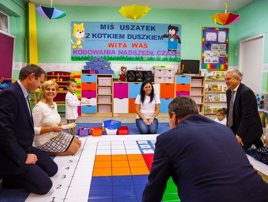 Minister odwiedził m.in. Przedszkole im. Misia Uszatka gdzie realizowany jest Program „Mistrzowie Kodowania Junior”.