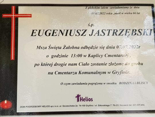Msza św. żałobna odprawiona zostanie 8 lipca w Kaplicy Cmentarnej w Gryfinie