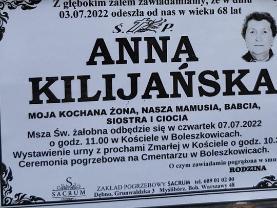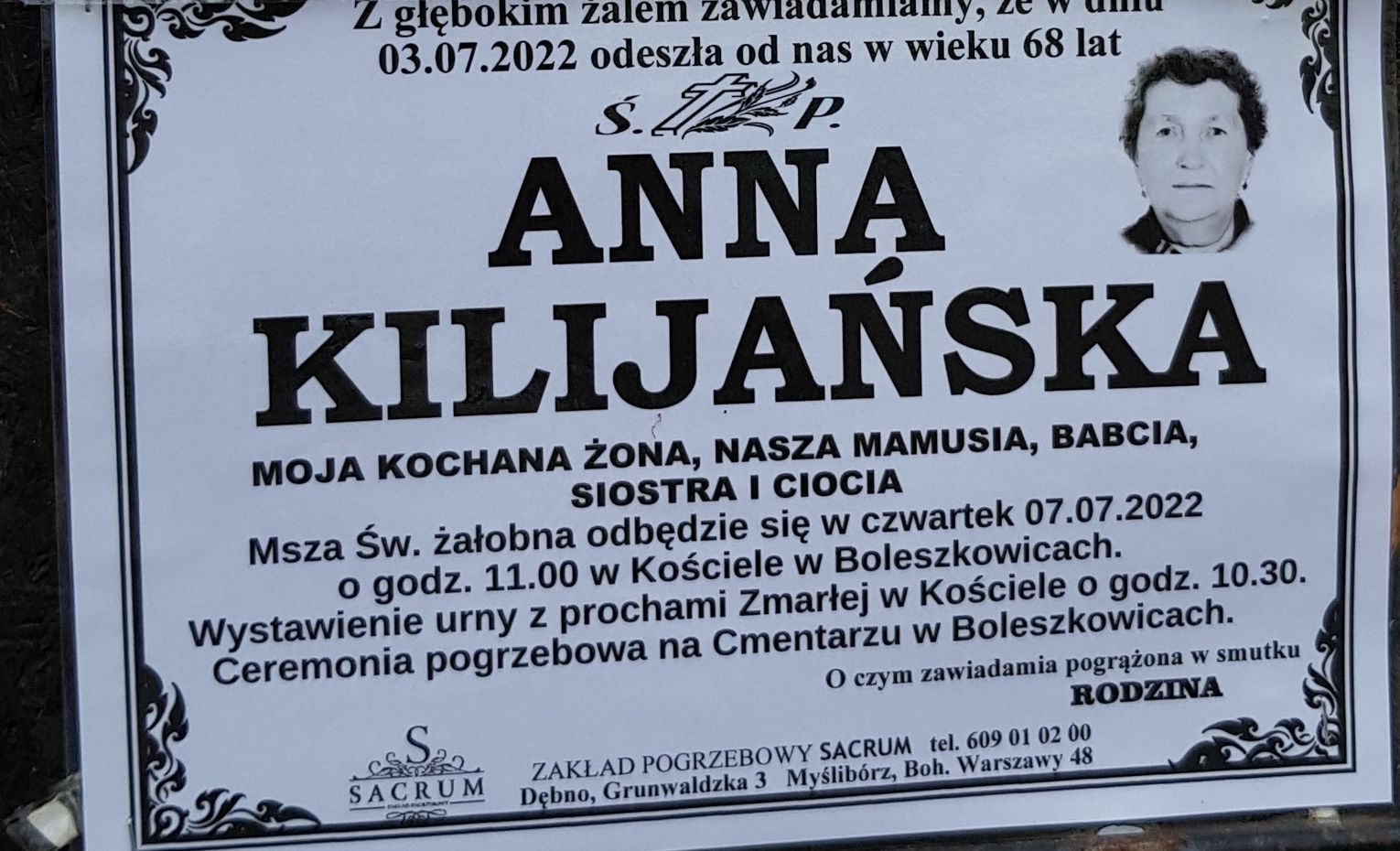 Anna Kilijańska zmarła 3 lipca 2022 r. w wieku 68 lat