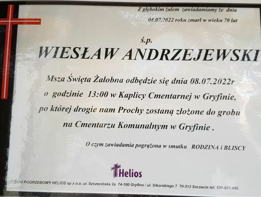 Prochy zmarłego złożone zostaną do grobu na Cmentarzu Komunalnym w Gryfinie.