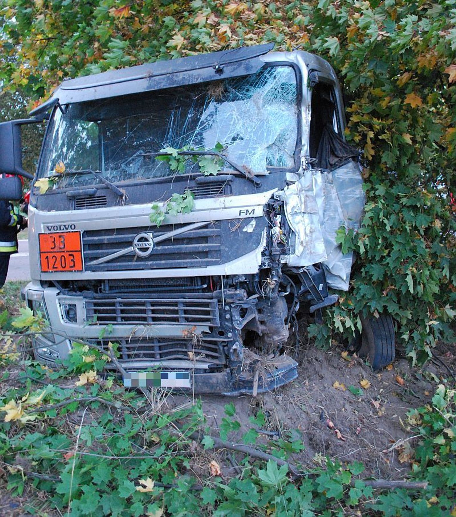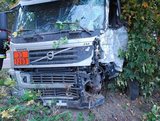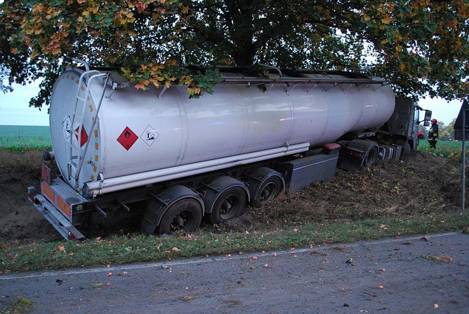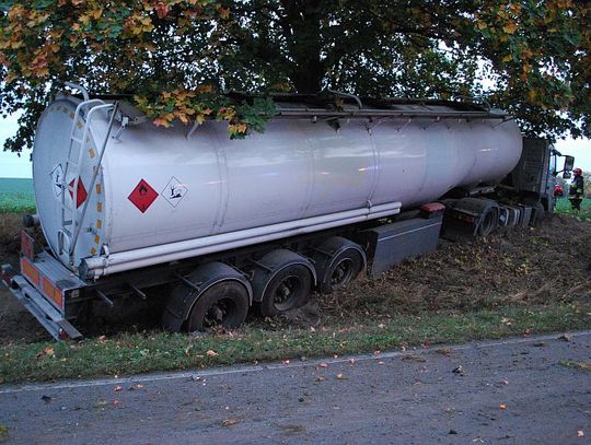 Ciężarówka przewożąca paliwo znalazła się w rowie i zatrzymała przy drzewie. Strażacy nie stwierdzili, aby cysterna uległa rozszczelnieniu. Kierujący samochodem-cysterną był trzeźwy.
