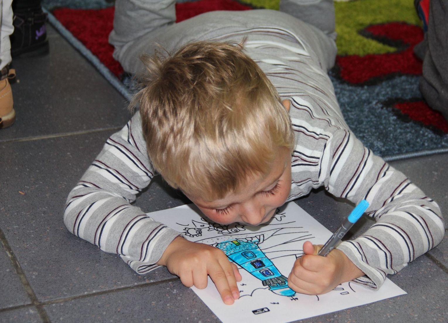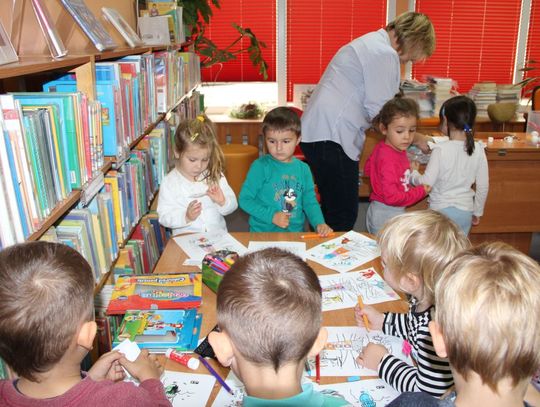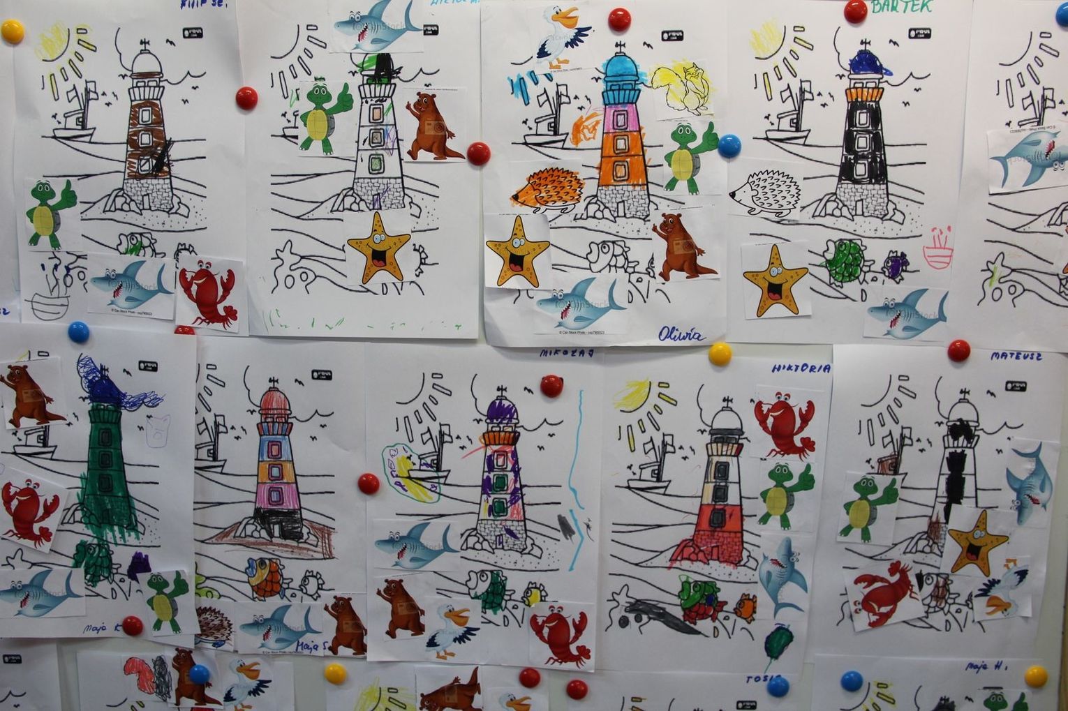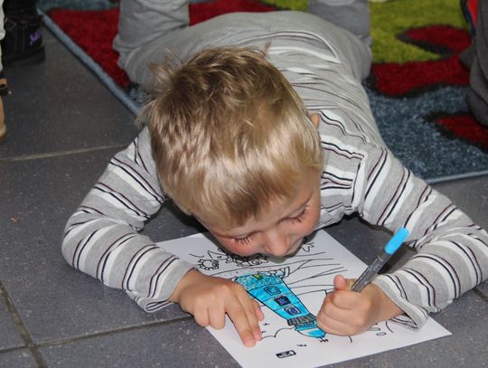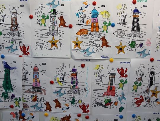 Maluchy, oj przepraszam, Tygryski z Przedszkola im. Kubusia Puchatka w Gryfinie żywo reagowały, słuchając i obserwując na ekranie fabułę bajki. Panie Mariola Małolepsza i Monika Suwała dbają o rozwój intelektualny swoich podopiecznych i od Maleństw przyprowadzają przedszkolaki do Biblioteki na Górnym Tarasie w Gryfinie, gdzie uczą się słuchać tekstów literackich, wiążąc z czytaniem różne formy plastyczne. Tak też było i tym razem. Kolorowanie latarni morskiej, naklejanie gości – figurek głównych bohaterów i koniecznym stał się - tort dla samotnego rekina.
