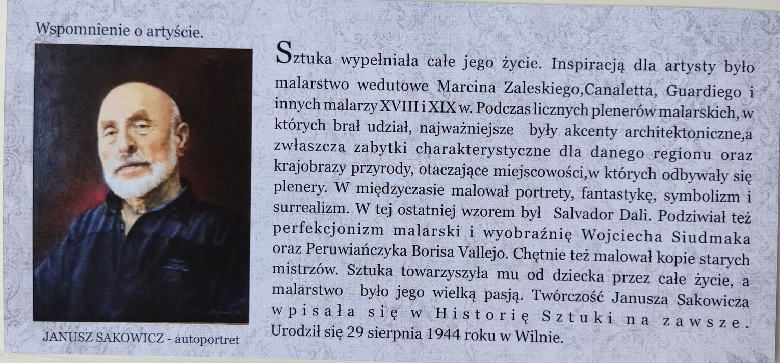 Organizatorami wystawy są Dom Kultury w Baniach i Oddział Zachodniopomorsko- Lubuski ZPTS (Związek Polskich Twórców Sztuki), którego Janusz Sakowicz był członkiem. Pragniemy przedstawić część prac i sylwetkę zasłużonego dla polskiej kultury artysty, który wystawiał swoje prace na wielu wystawach w kraju i poza granicami Polski. Brał udział w wystawach konkursowych, między innymi w Krakowie, gdzie trzykrotnie zdobył I nagrodę. Jego obraz "Wizja Szczecina" bardzo długo prezentowany był w Muzeum Narodowym w Szczecinie.